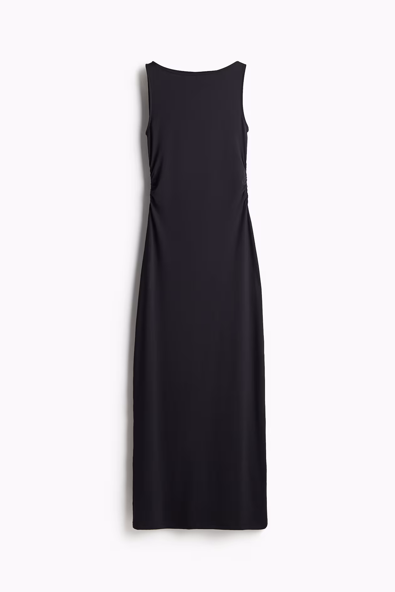 Fitted, sleeveless, ankle-length dress in stretch jersey. Boat neck and gathers at sides of waist for a gently draped effect.