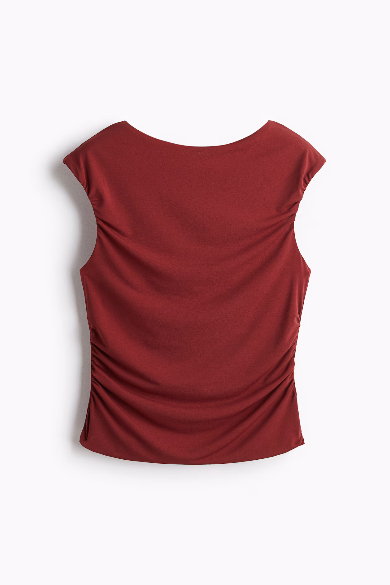 Fitted top in soft jersey. Boat neck, gathers at sides for a gently draped effect at front, and cap sleeves. Jersey lining.