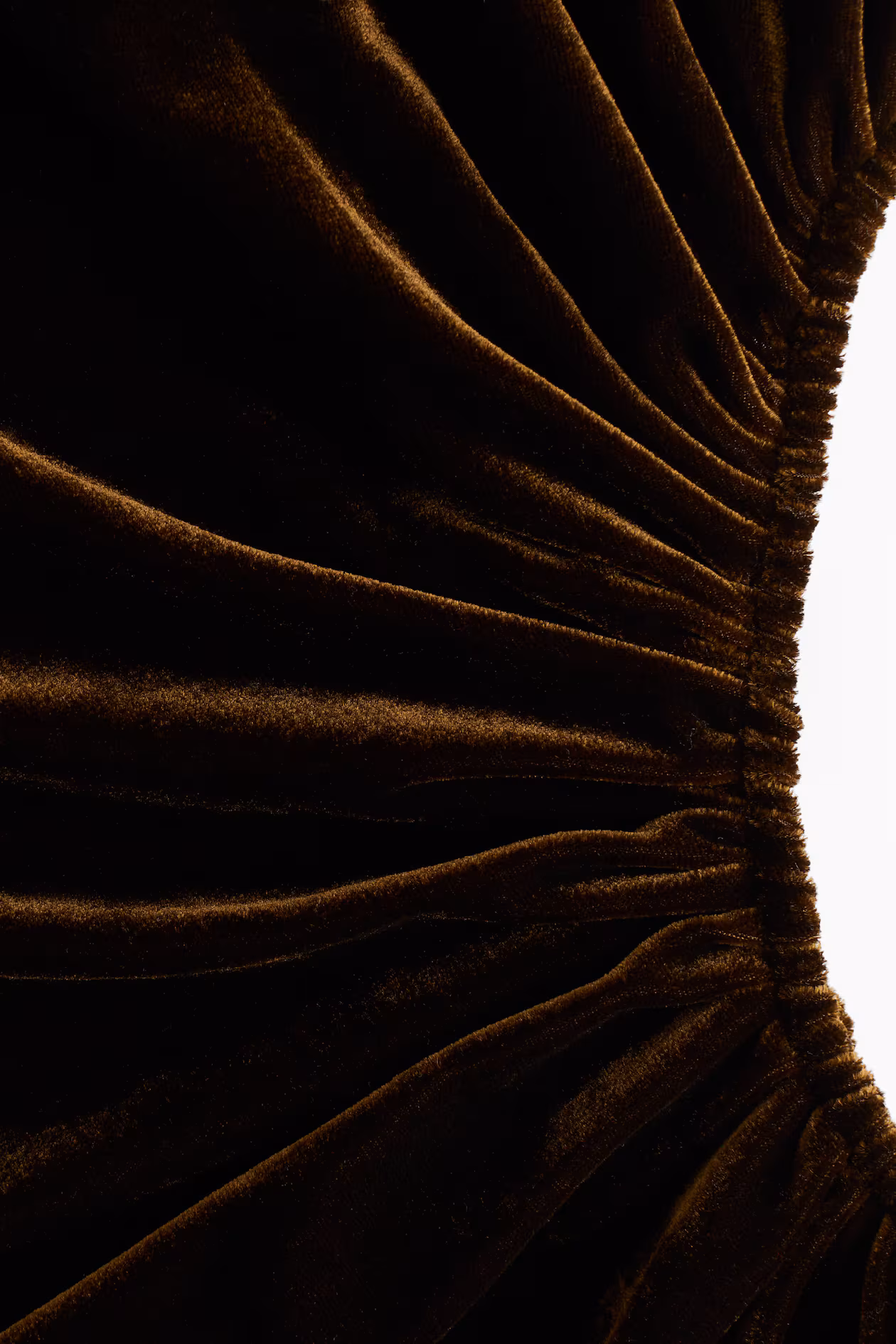 Long dress in soft velour with a gently flared skirt. Round neckline, a circular cutout at one side of waist with gathers for a draped effect, and 3/4-length sleeves.