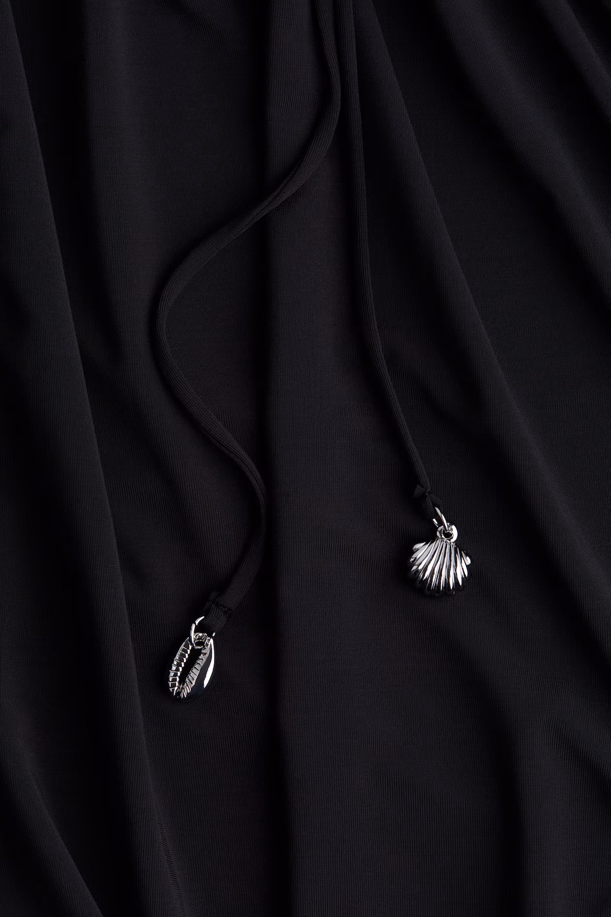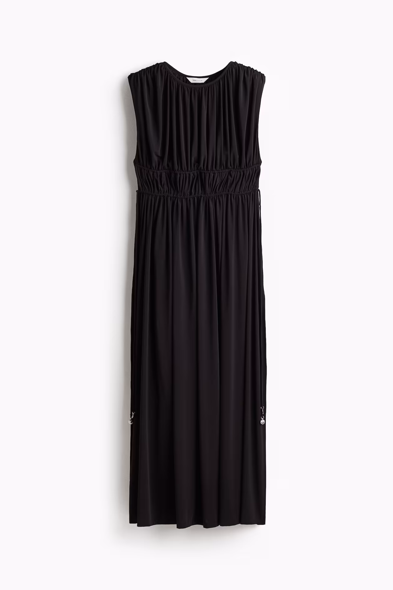 Loose-fit, sleeveless, ankle-length dress in stretch jersey. Round neckline, gathers at top, and piping below bust. Narrow drawstring at waist to tie at sides. High slit at sides.