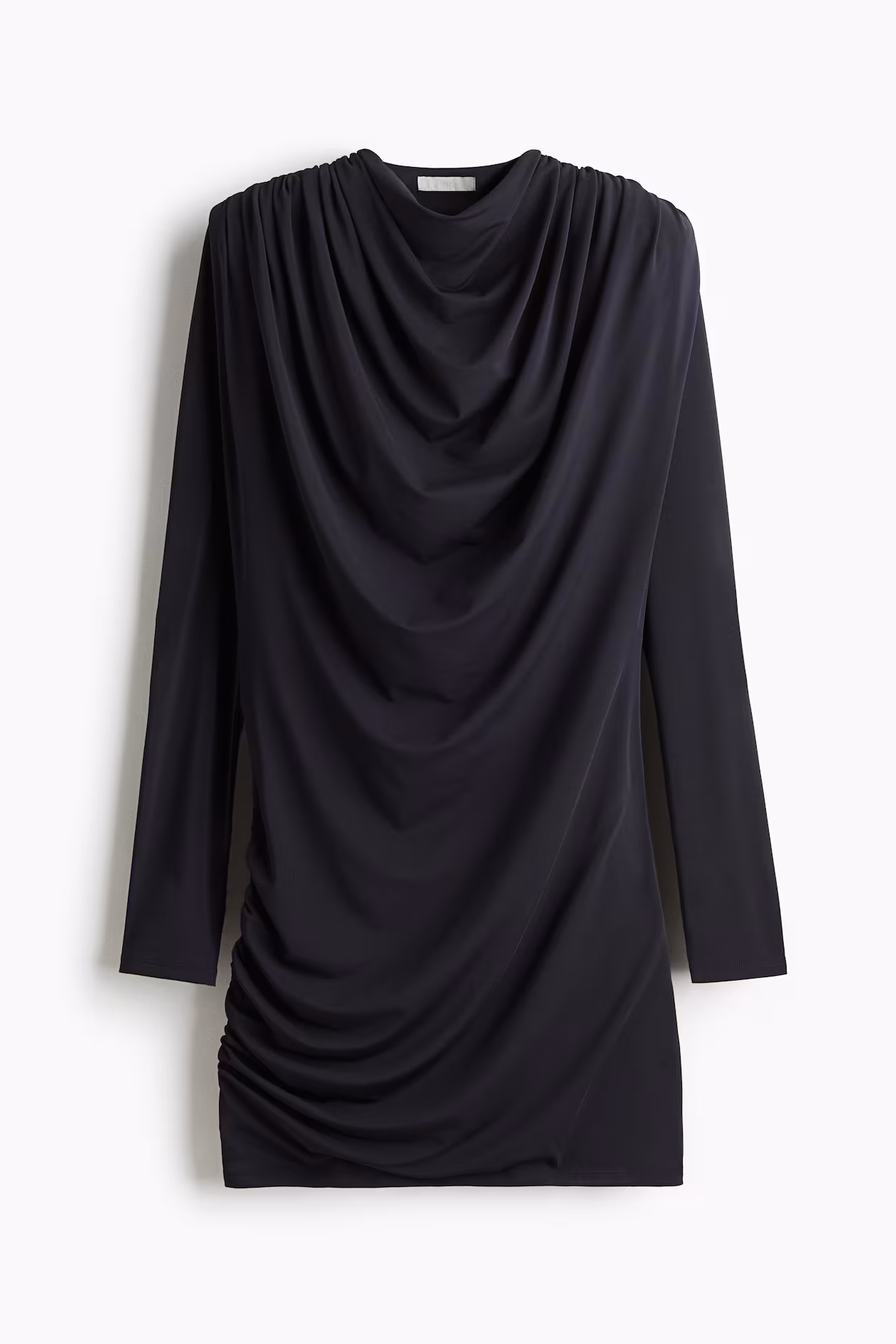 Short dress in jacquard jersey. Cowl neck, shoulder pads, and long sleeves. Gathers on shoulders and at one hip for a draped effect. Lined.