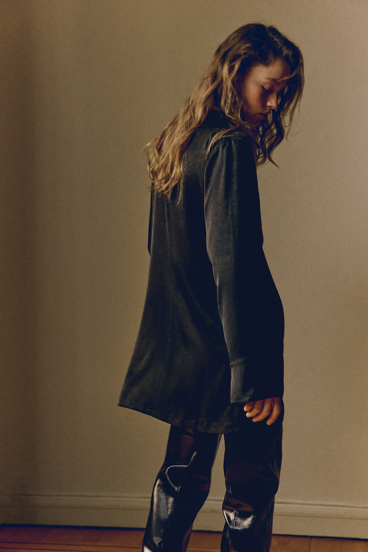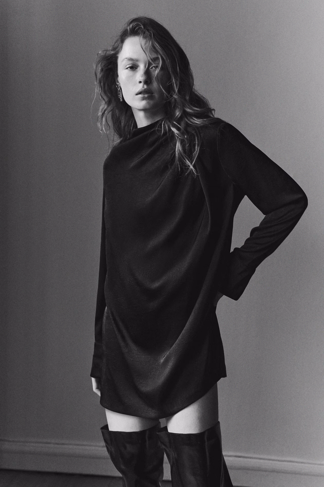 Short, loose-fit dress in lightly crinkled woven fabric. Small stand-up collar, pleats on one shoulder for a draped effect at front, and a concealed zipper at back with hook-and-eye fastener. Long sleeves with a slit at cuffs. Unlined.