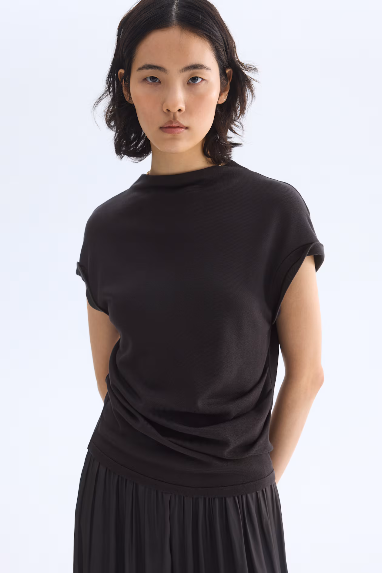 Fine-knit top in a viscose blend. Small stand-up collar, short sleeves with folded trim at cuffs, and pleats at one side of waist for a gently draped effect.