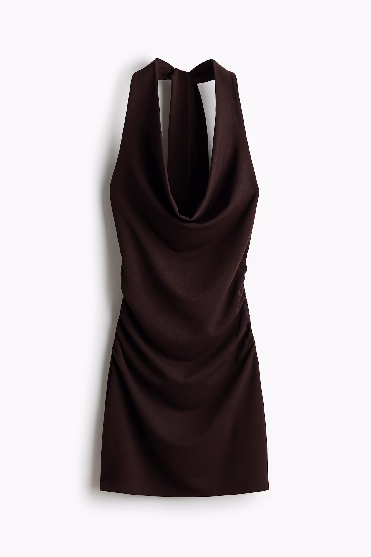 Fitted, sleeveless mini dress in ponte jersey. Wide halterneck ties, low-cut cowl neck, and gathers at sides for a draped effect.