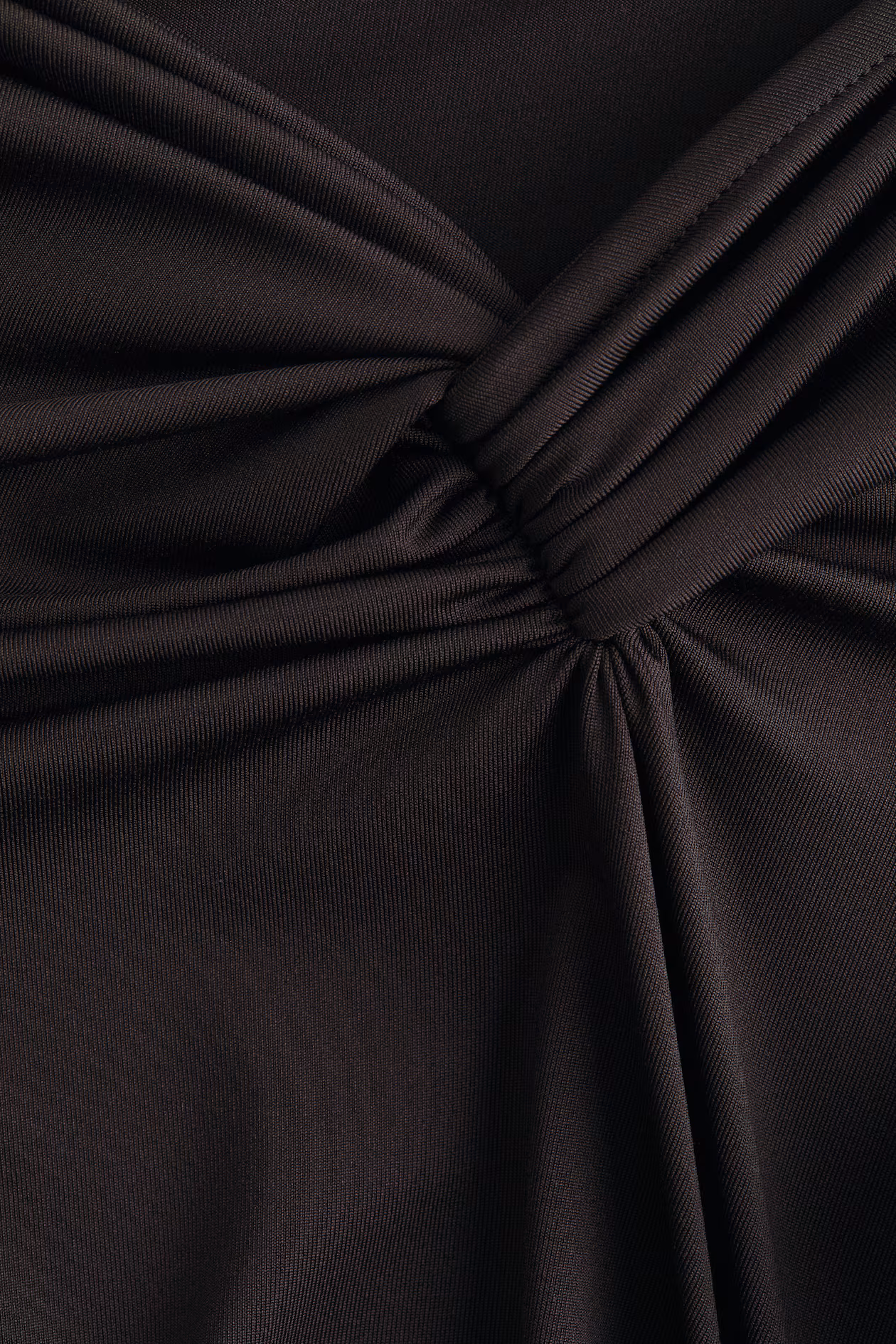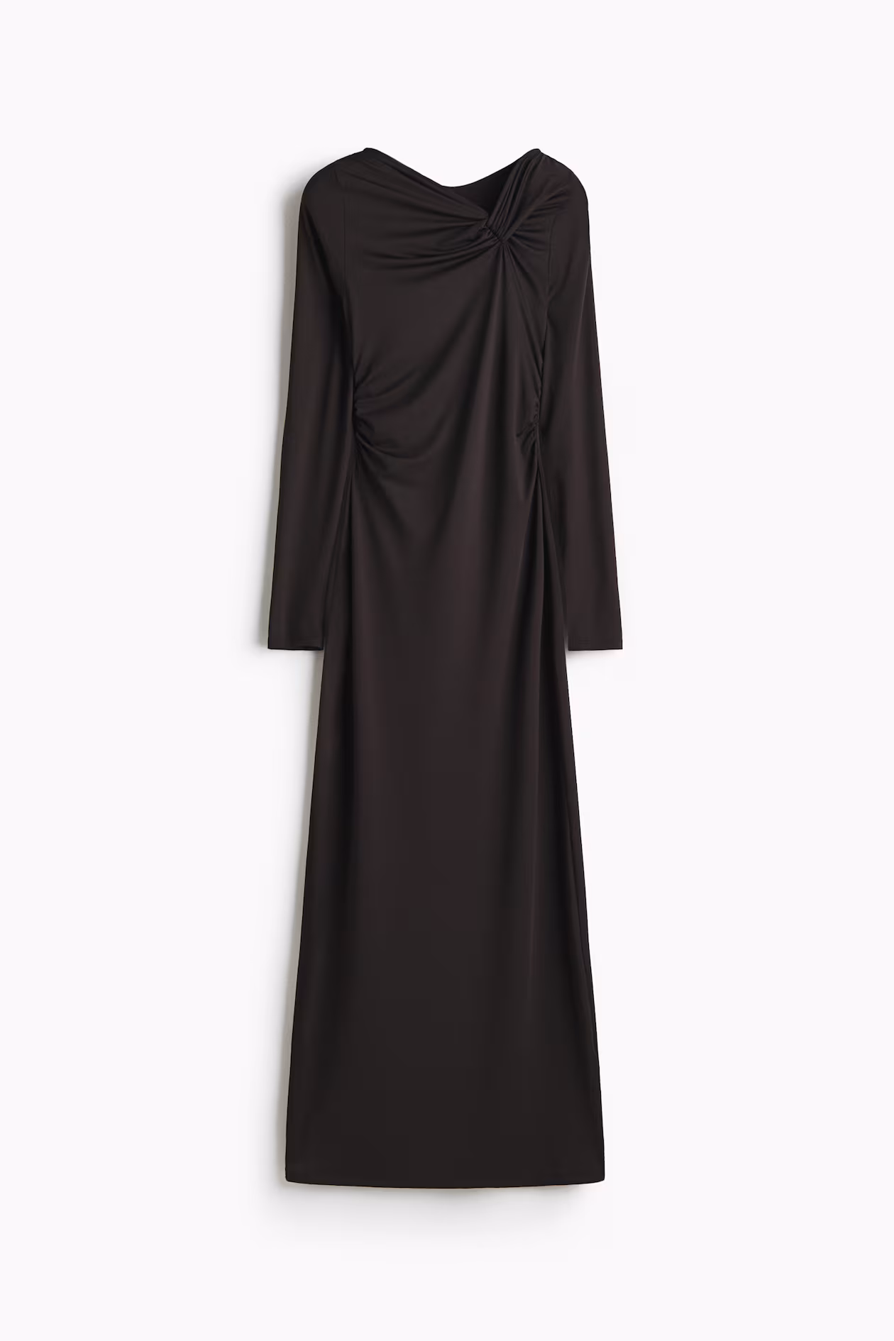 Long, fitted dress in soft jersey. Asymmetric neckline with a twisted detail at top, long sleeves, and gathers at sides of waist for a gently draped effect.
