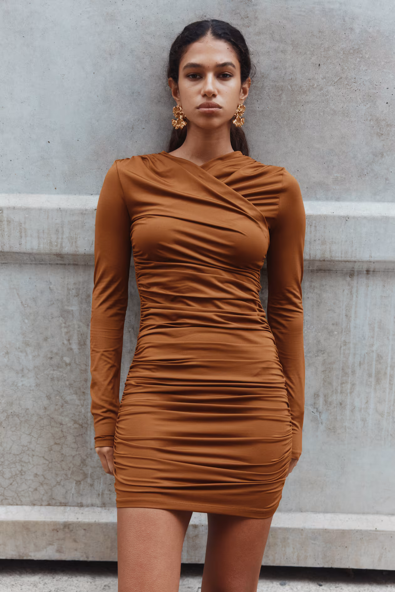 Slim-fit, long-sleeved mini dress in stretch jersey with a wrapover V-neck. Gathers on shoulders and at sides for a draped effect at front.
