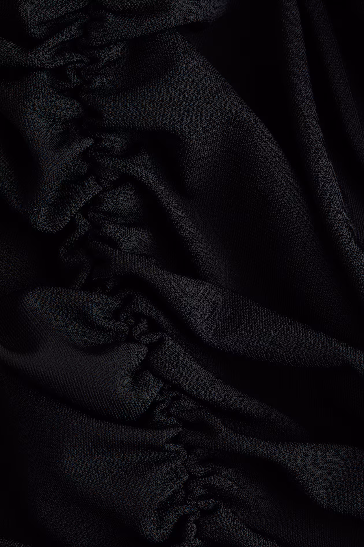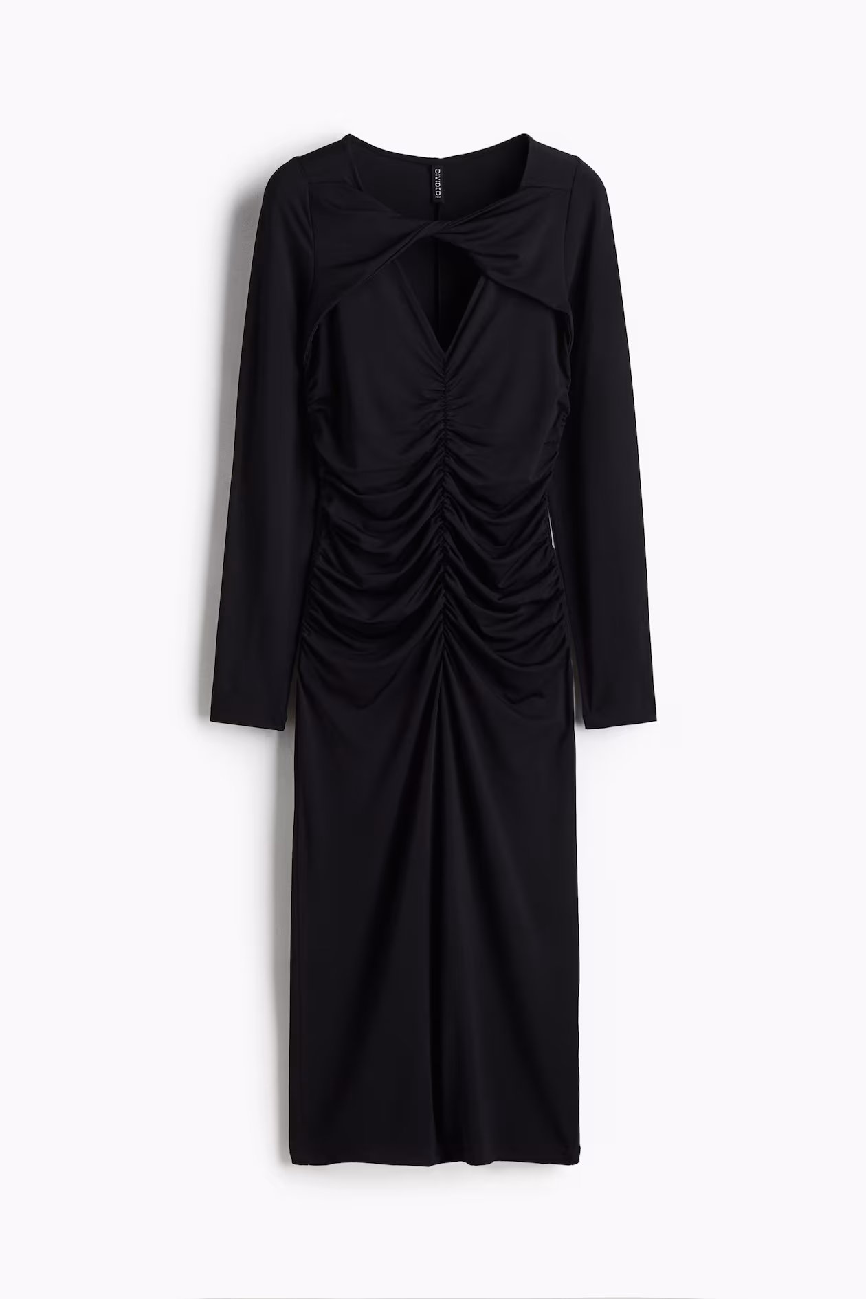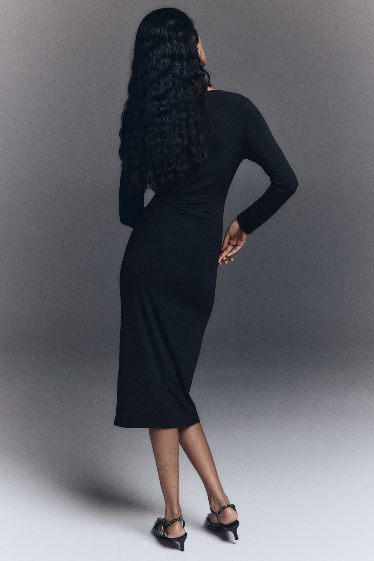 Long, fitted dress in stretch jersey with gathers at front and at sides for a draped effect. Low-cut V-shaped neckline with a twisted panel at front for a layered look. Long sleeves.