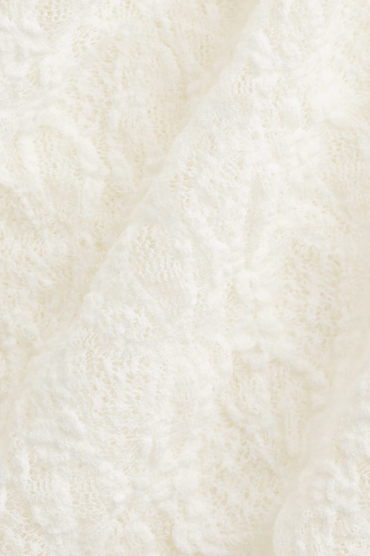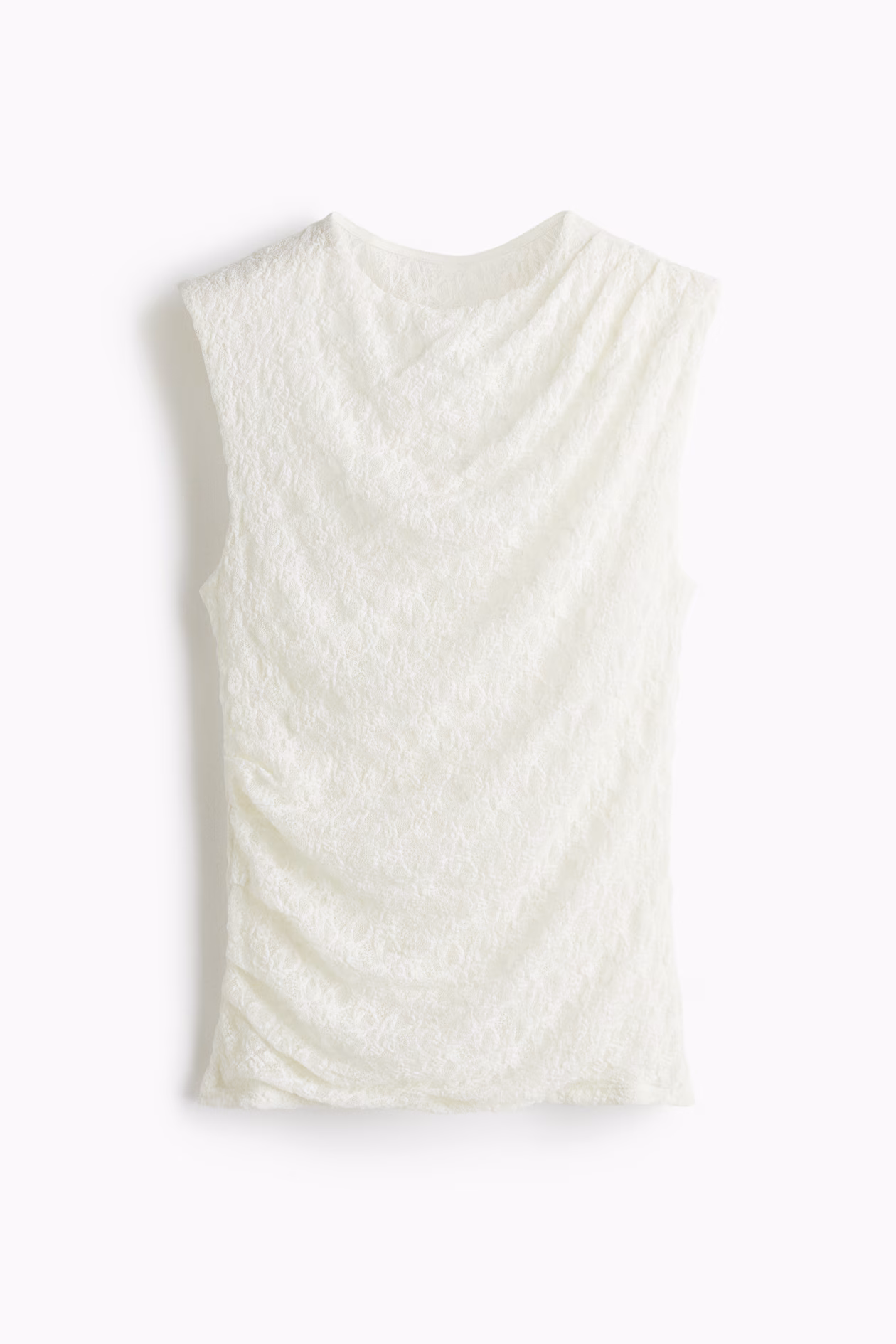 Fitted, sleeveless top in soft, lace-look jersey with a round neckline. Gathers on one shoulder and at one side of waist for a gently draped effect. Partly lined.