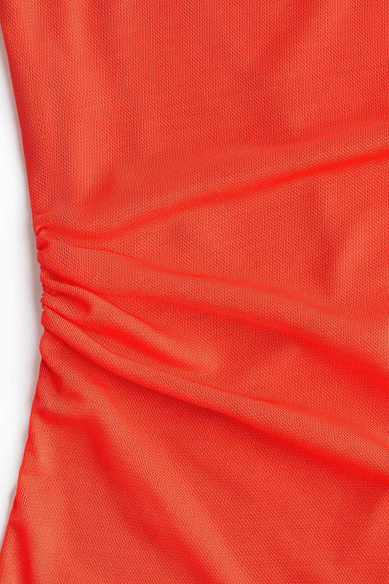 Short, fitted dress in mesh. Extra-narrow shoulder straps, cowl neck, and gathers at one side for a gently draped effect. Jersey lining.