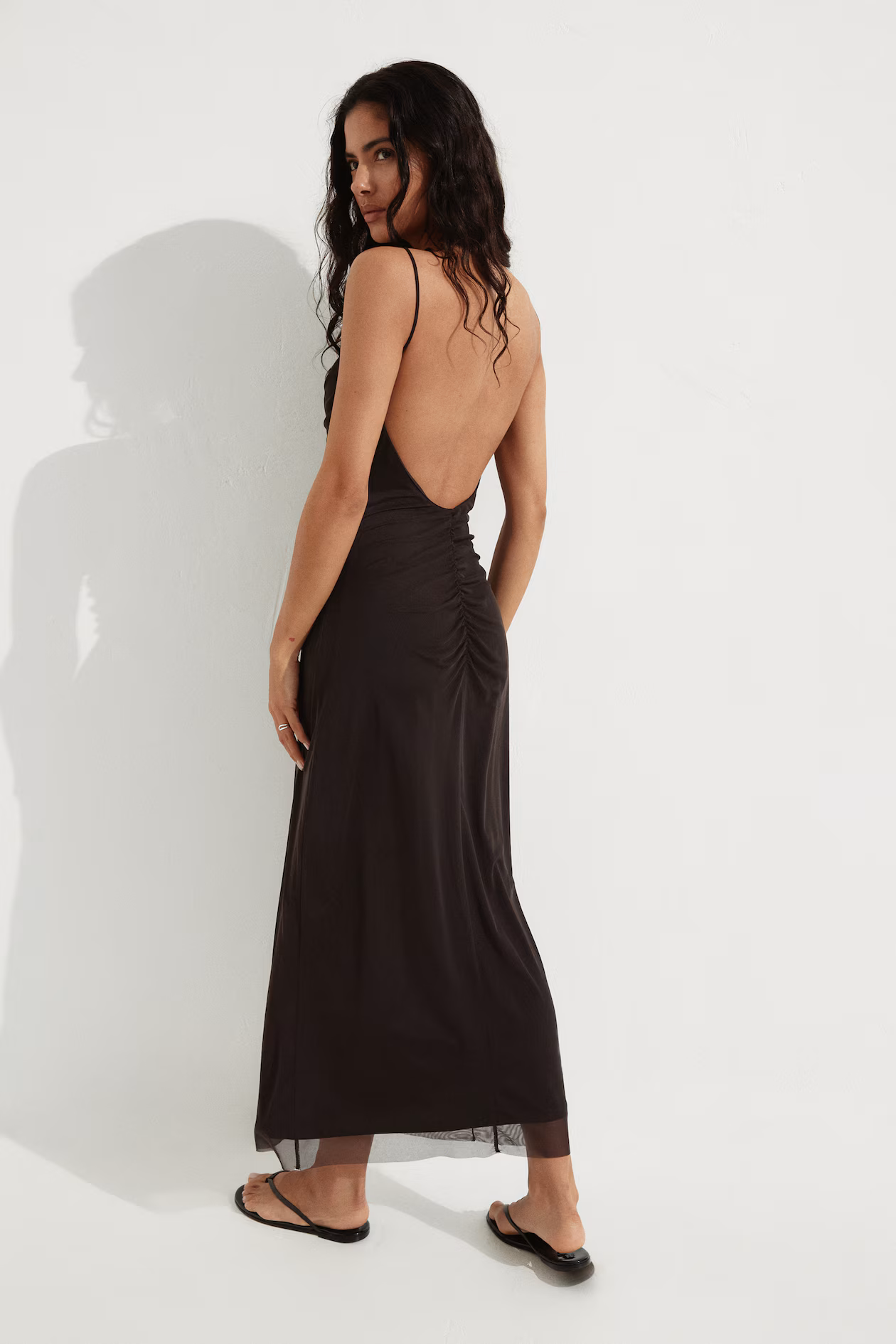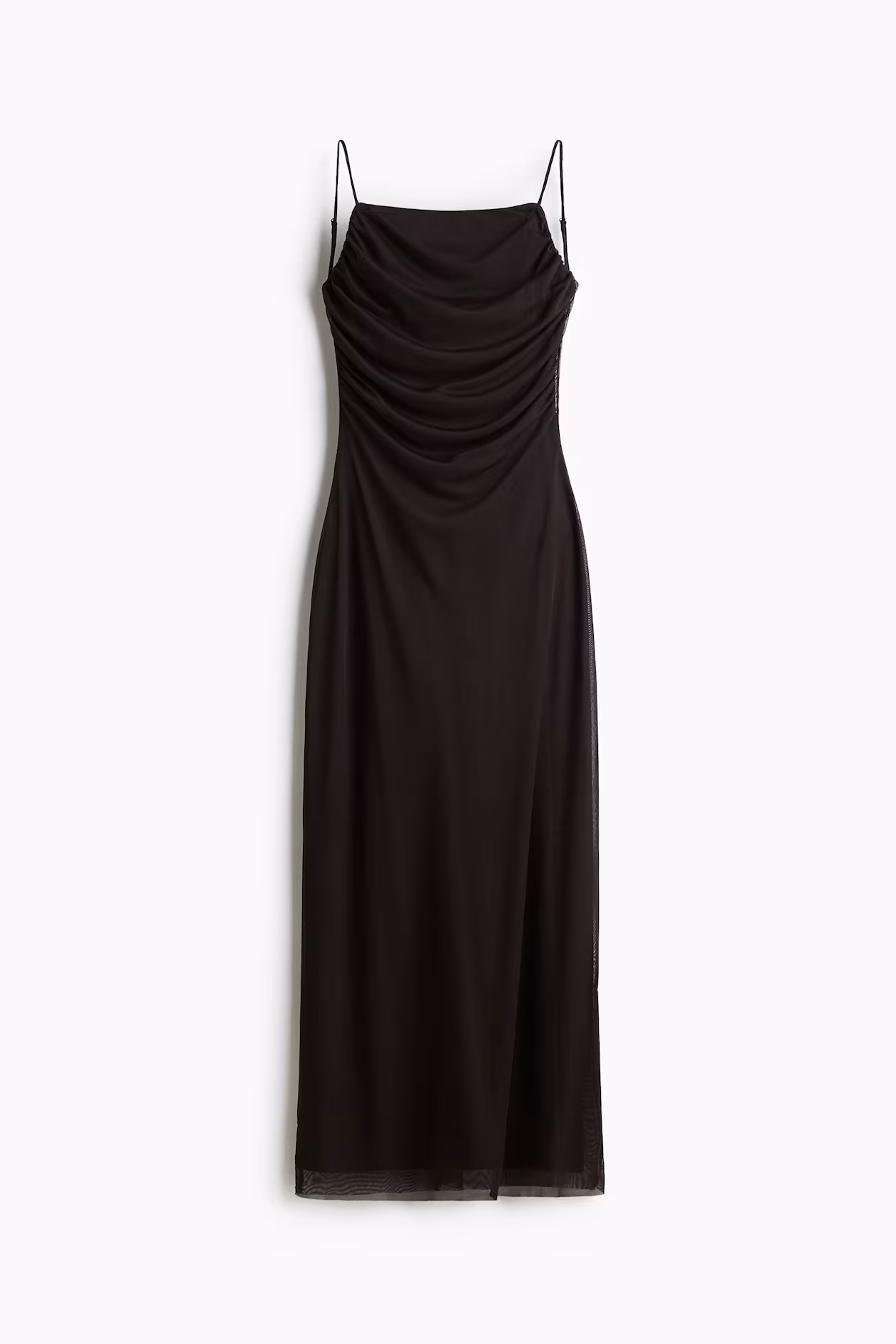 Long, fitted dress in mesh. Narrow, adjustable shoulder straps, straight neckline at front, and low, V-shaped back with a gathered seam. Gathers at sides for a gently draped effect. Lined.