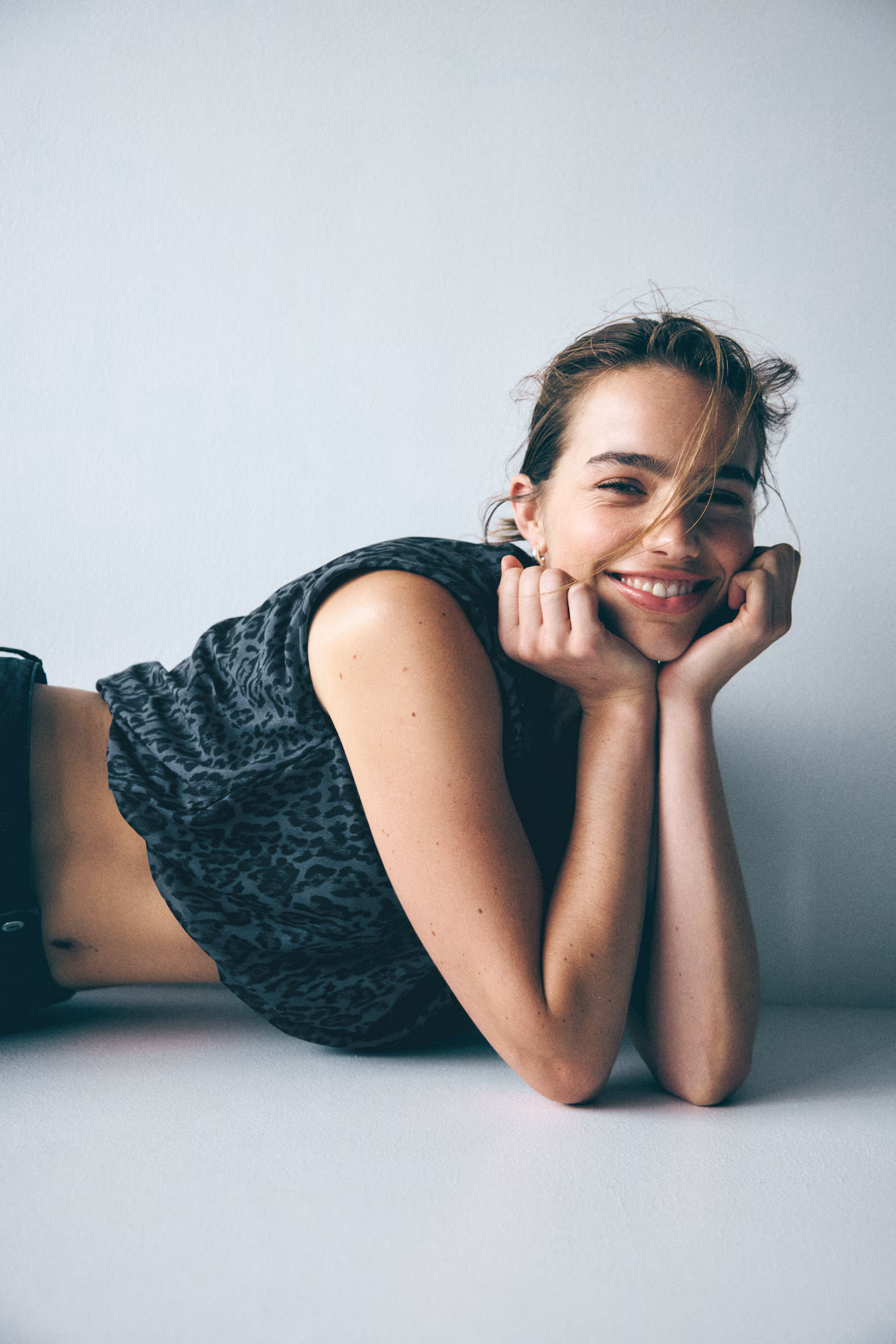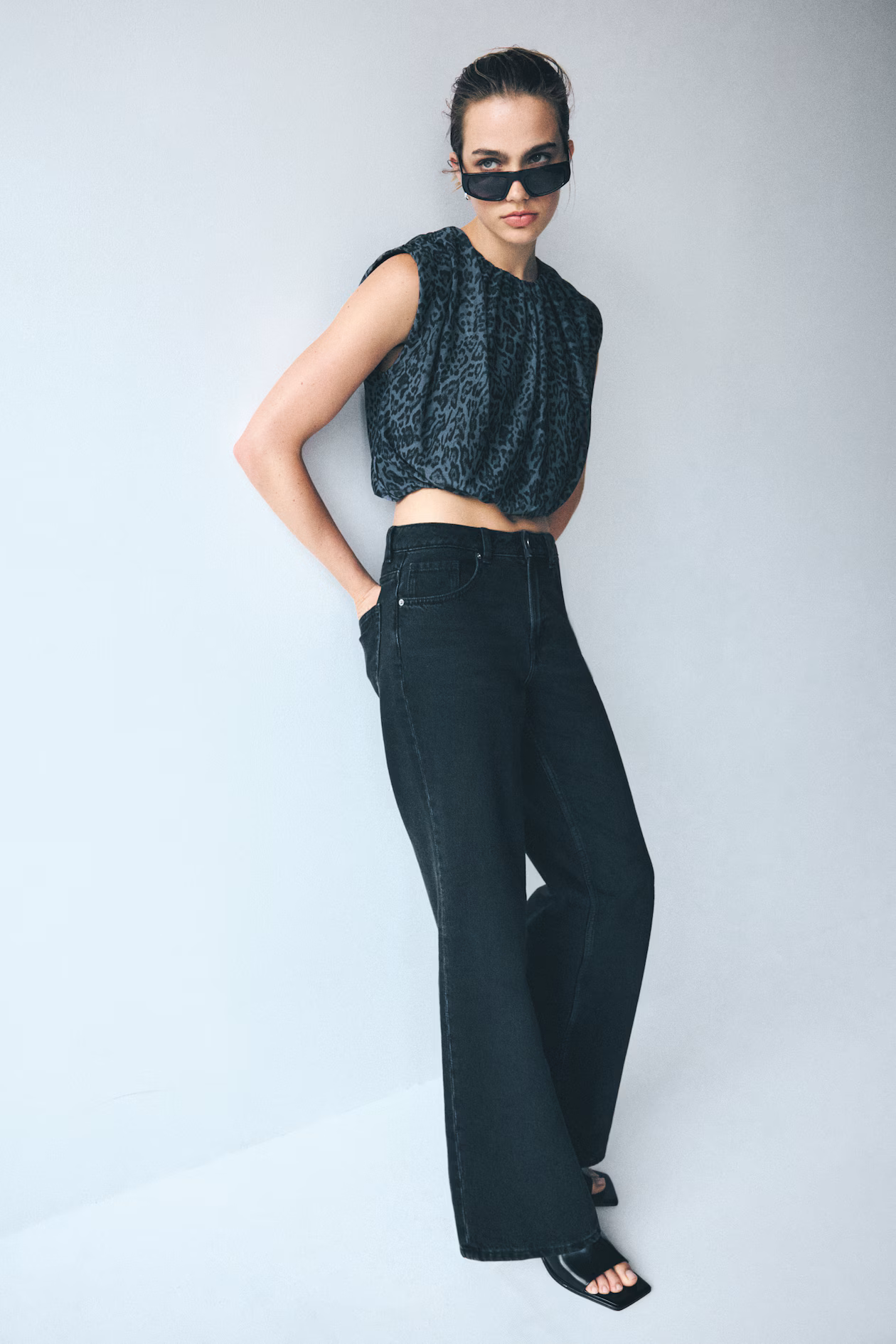 Short, loose-fit, sleeveless top in mesh with gathered seams for a gently draped effect. Round neckline, concealed elastic at hem, and jersey lining.