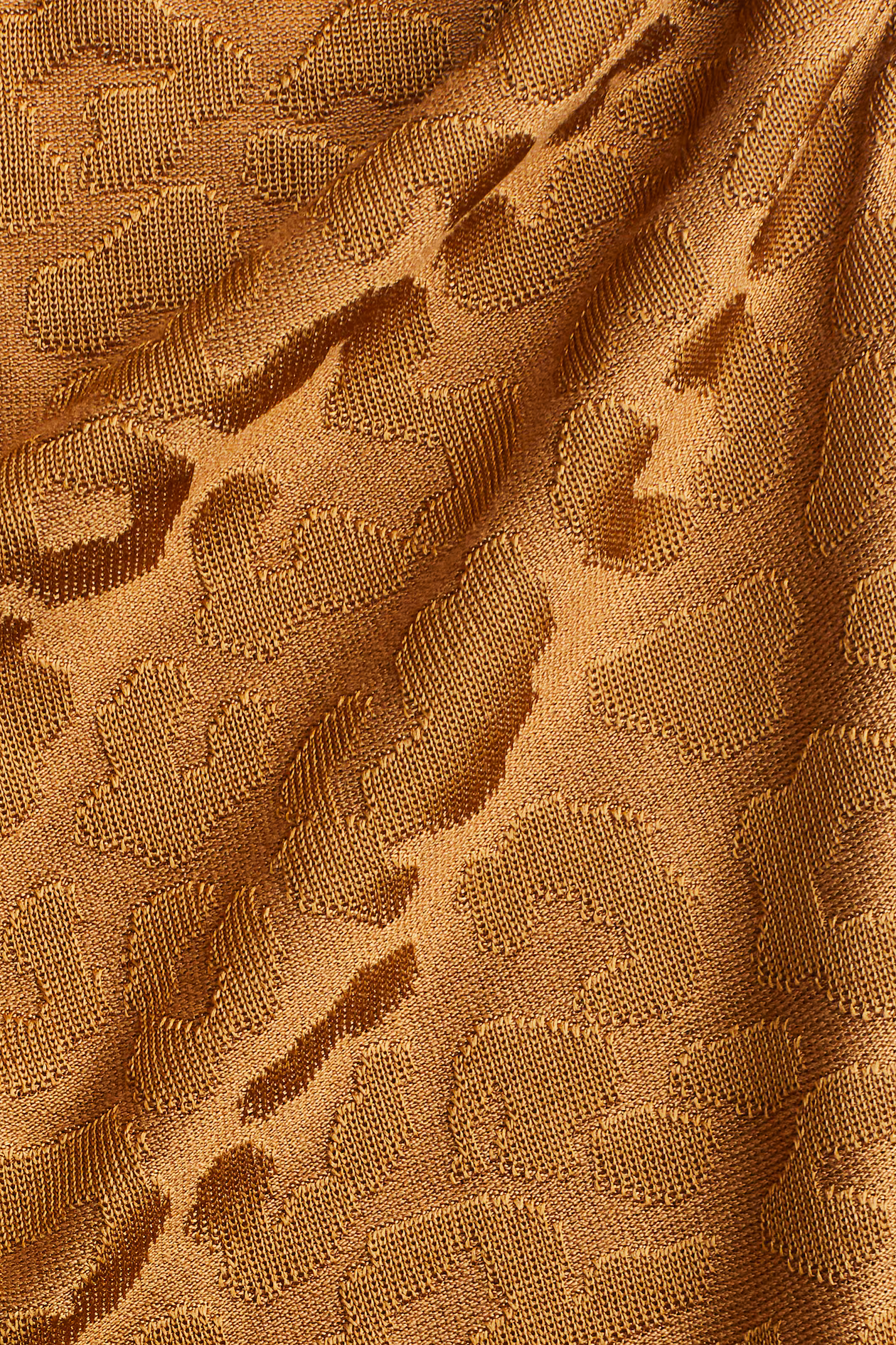 Calf-length dress in lustrous jacquard jersey. Cowl neck, dropped shoulders, and long sleeves. Gathers at sides for a draped effect. Unlined.