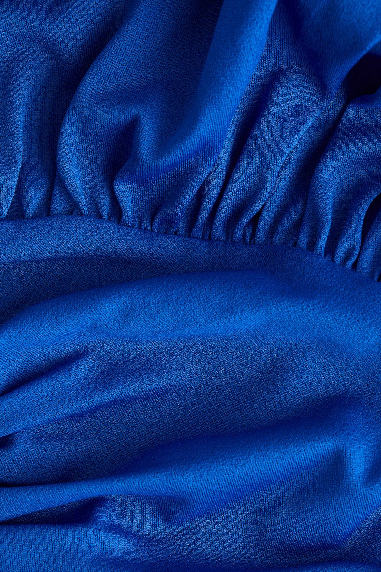Thong bodysuit in soft jersey with one wide shoulder strap. Gathered seam at front, at one side, and on shoulder for a gently draped effect. Concealed snap fasteners at gusset.