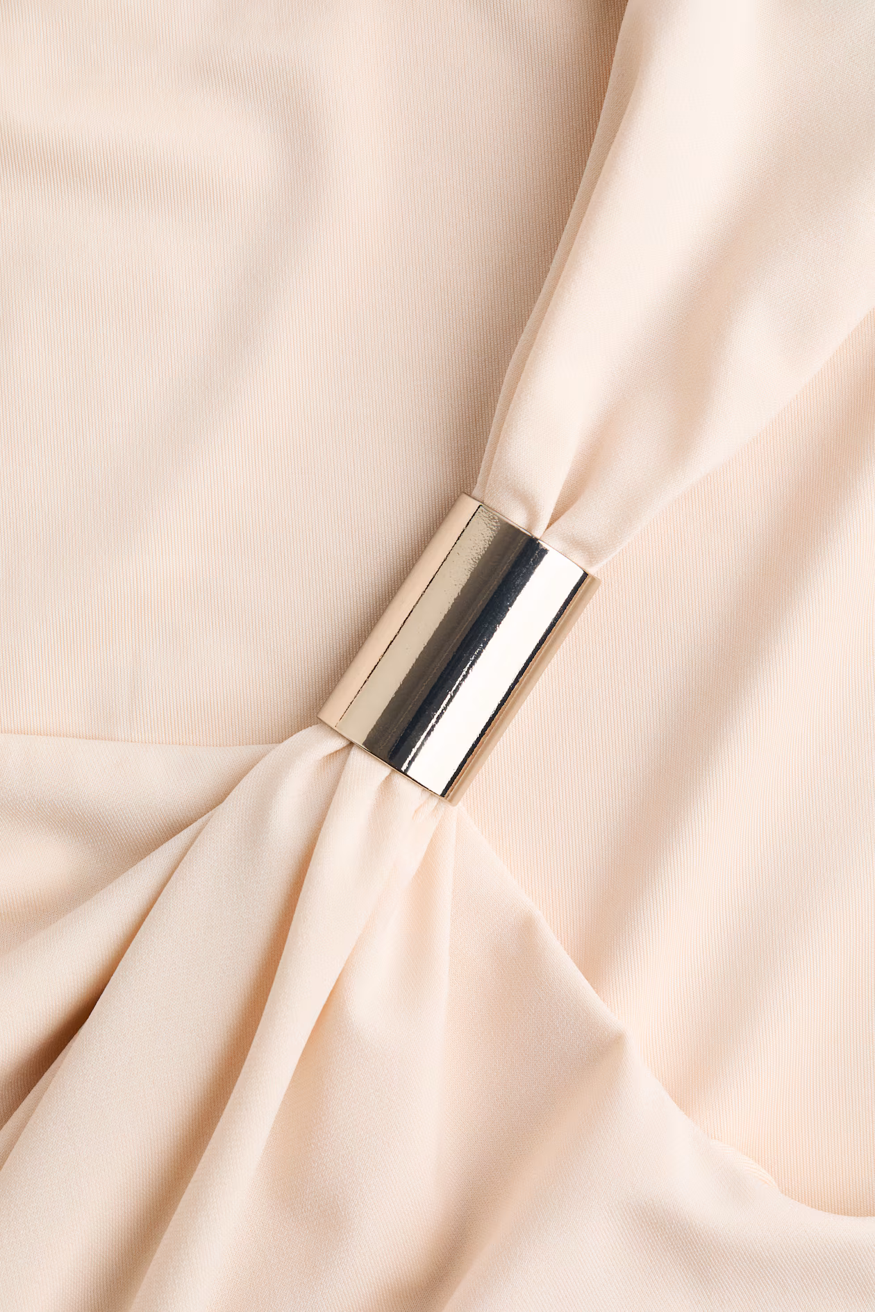 Sleeveless top in stretch jersey. Asymmetric neckline, gathered shoulder strap at one side with a metal detail, and ruched seam at opposite side of waist for a draped effect. Lining at bust.