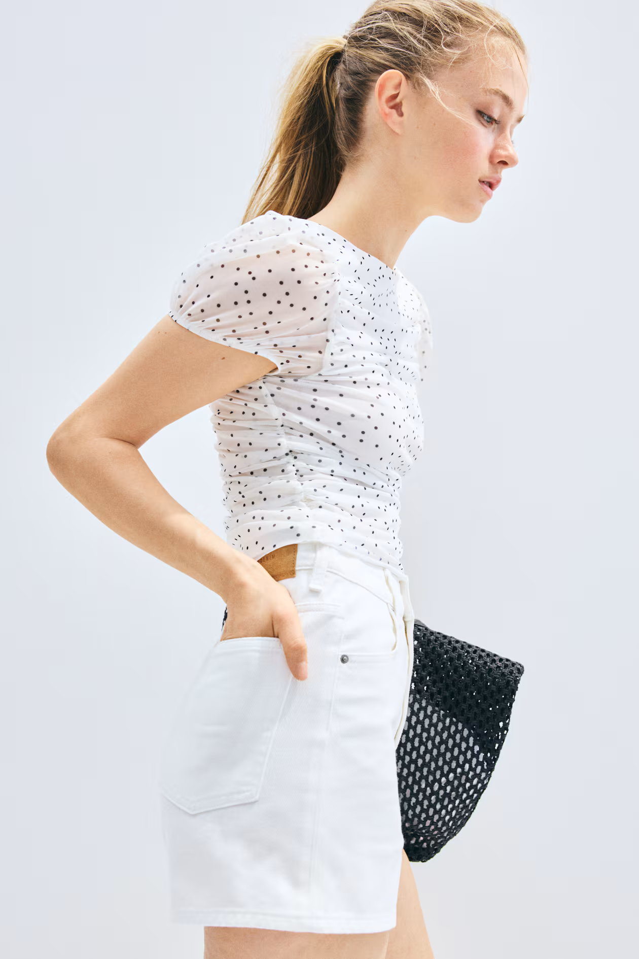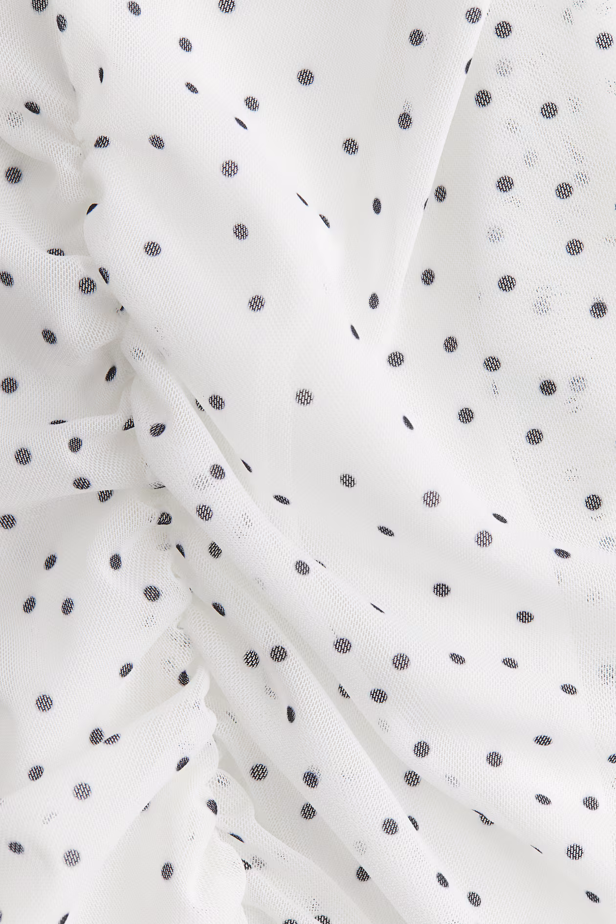Short, fitted top in patterned mesh with ruching at sides for a draped effect. Boat neck and short puff sleeves with narrow elastic at cuffs. Partly lined.