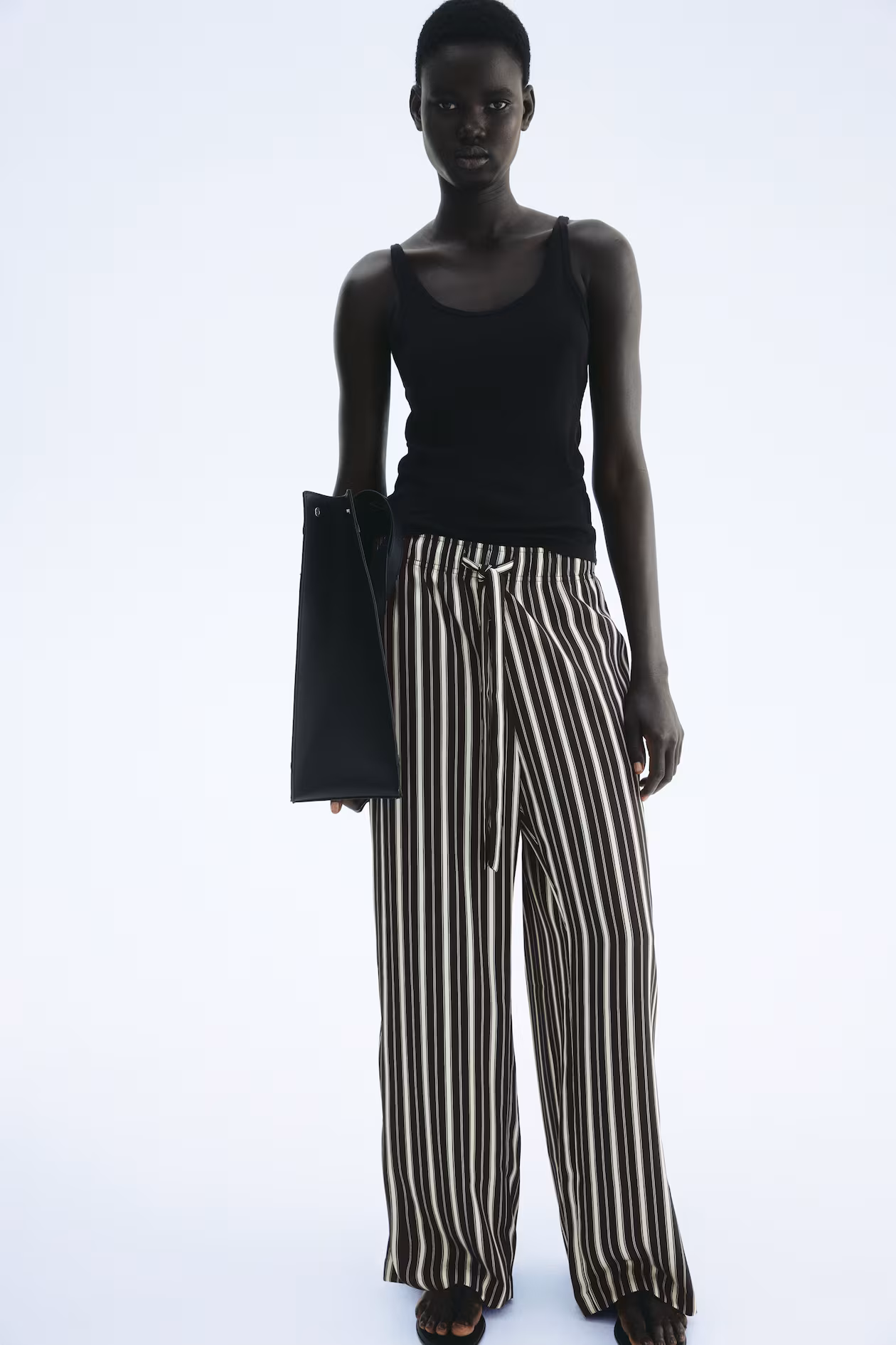 Loose-fit pants in twill. High waist, wide drawstring and covered elastic at waistband, and discreet side pockets. Wide legs.