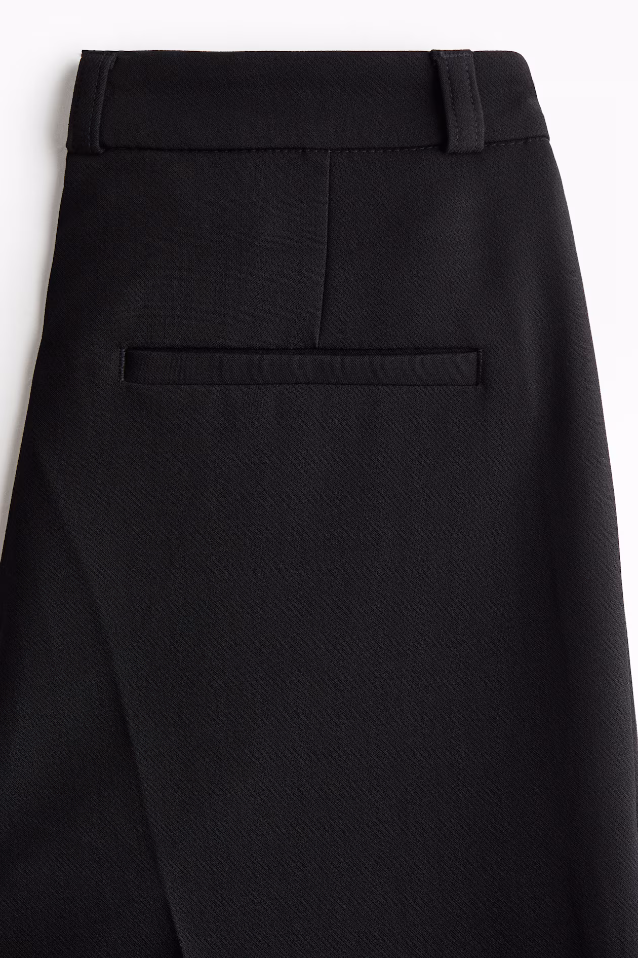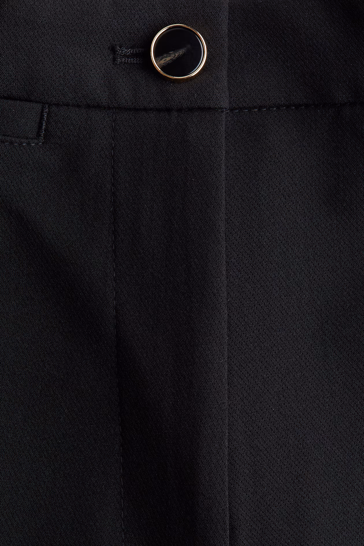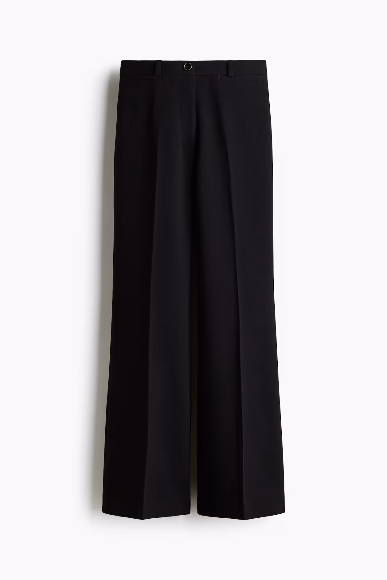 Fitted dress pants in woven fabric. High waist, zip fly with button, mock welt front pockets, and mock welt back pockets. Flared legs with creases at front and back.