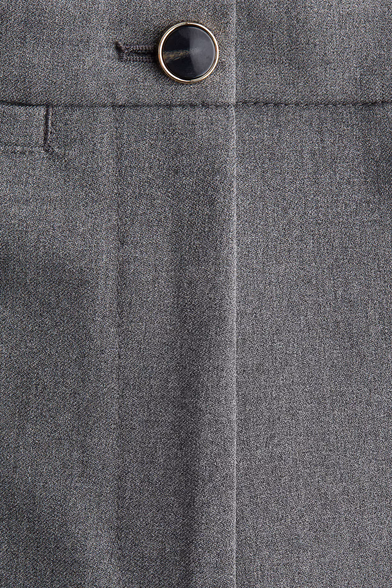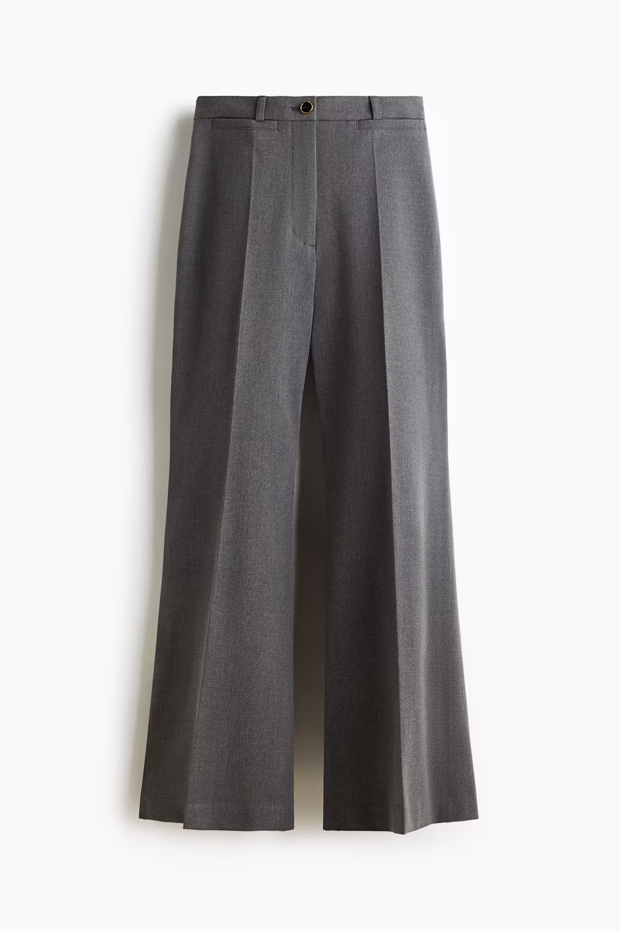 Fitted dress pants in woven fabric. High waist, zip fly with button, mock welt front pockets, and mock welt back pockets. Flared legs with creases at front and back.