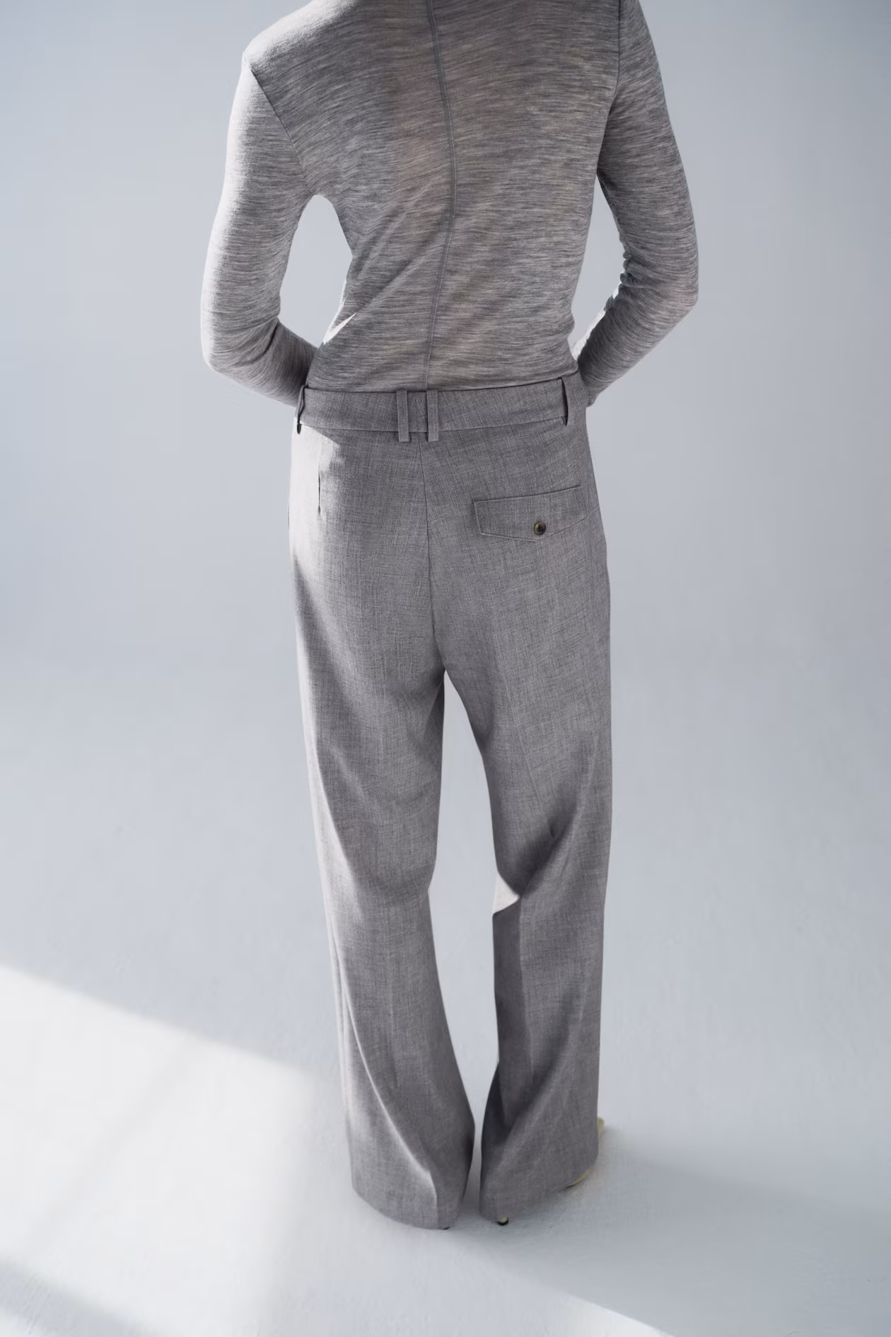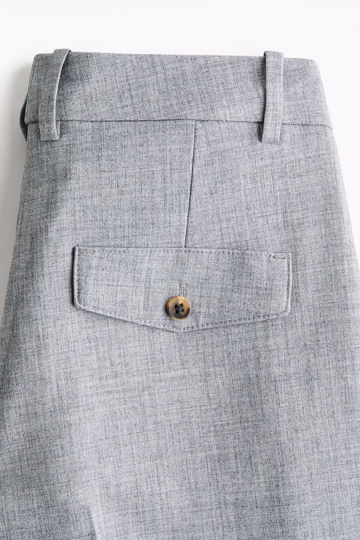 Dress pants in woven fabric with creases at front and back. Extended waistband tab with one visible and one concealed button, and a zip fly. Diagonal side pockets, a mock back pocket with flap and button, and straight legs.