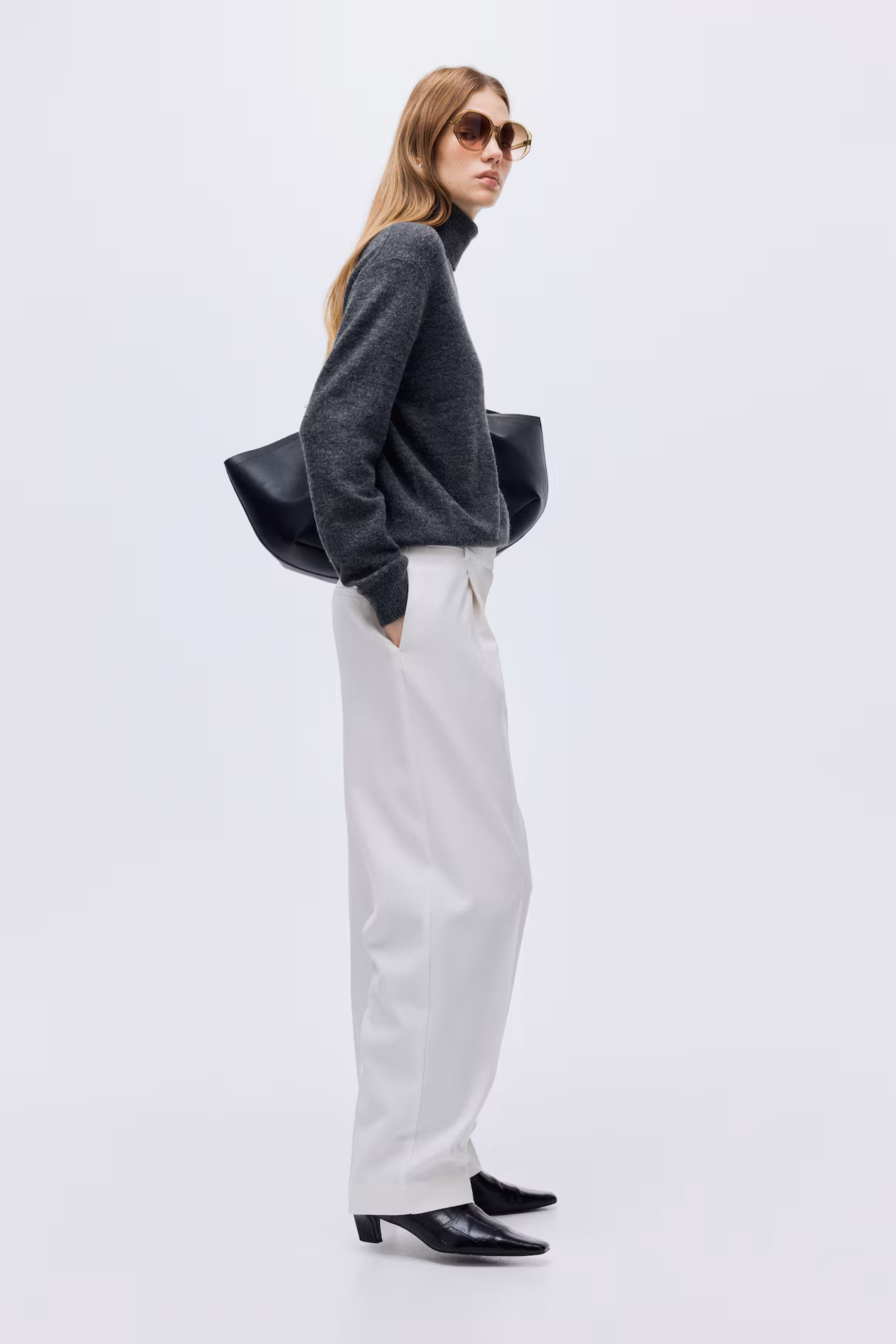 Loose-fit dress pants in woven fabric with pleats at front. High waist and zip fly with concealed button and hook-and-bar fastening. Discreet side pockets, mock welt back pockets, and tapered legs with creases at front and back.