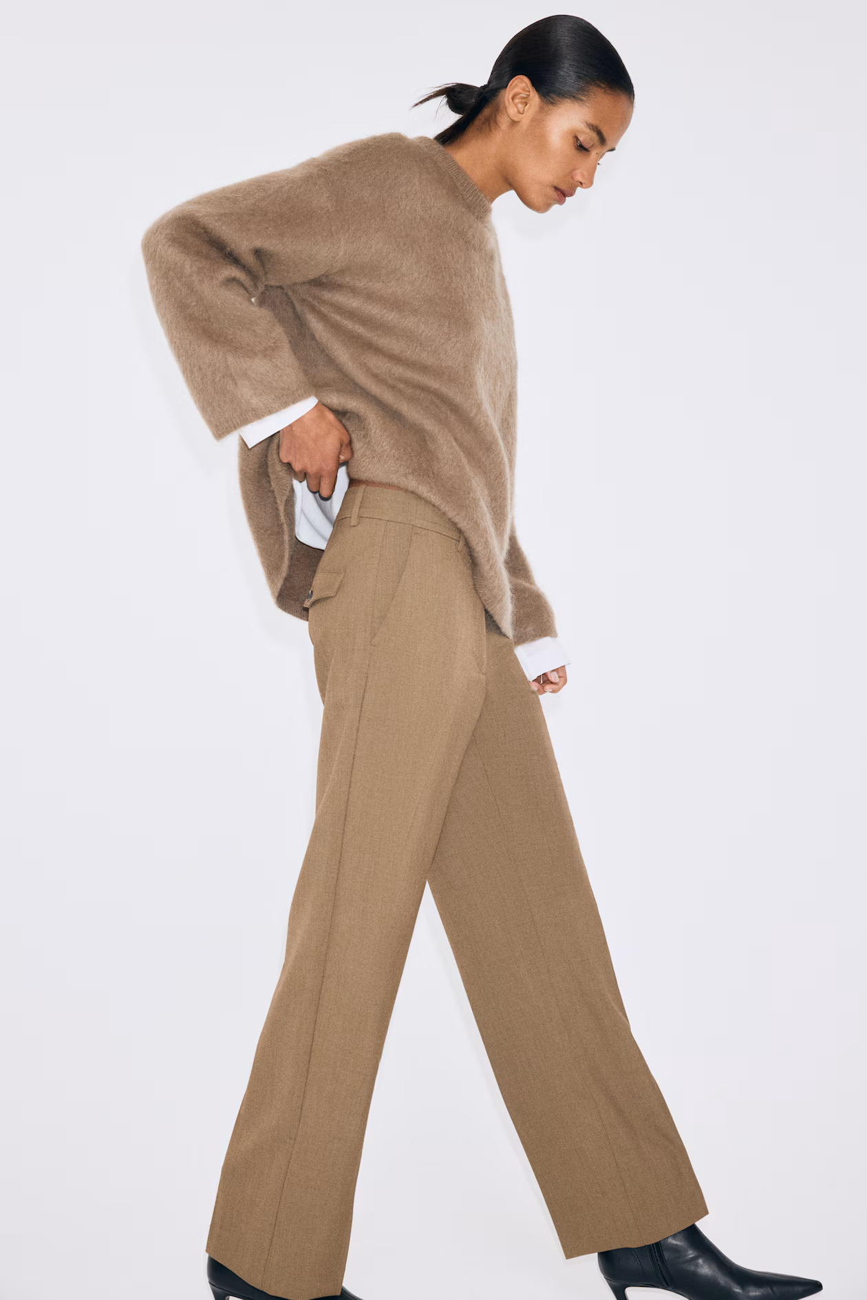 Dress pants in woven fabric with creases at front and back. Extended waistband tab with one visible and one concealed button, and a zip fly. Diagonal side pockets, a mock back pocket with flap and button, and straight legs.