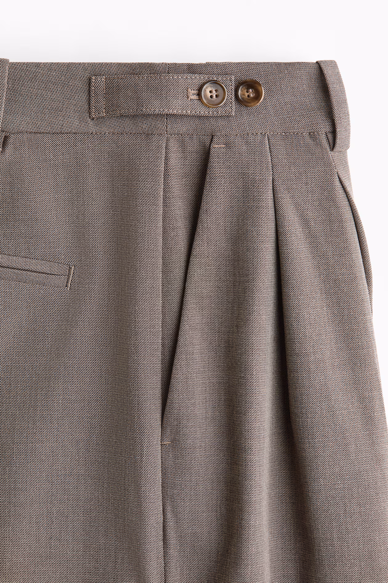 Dress pants in woven fabric with pleats at front. Regular waist, extended waistband tab with hook-and-bar fasteners, adjustable tab at sides with button, and zip fly with concealed button. Diagonal side pockets and welt back pockets. Straight legs with creases at front and back.