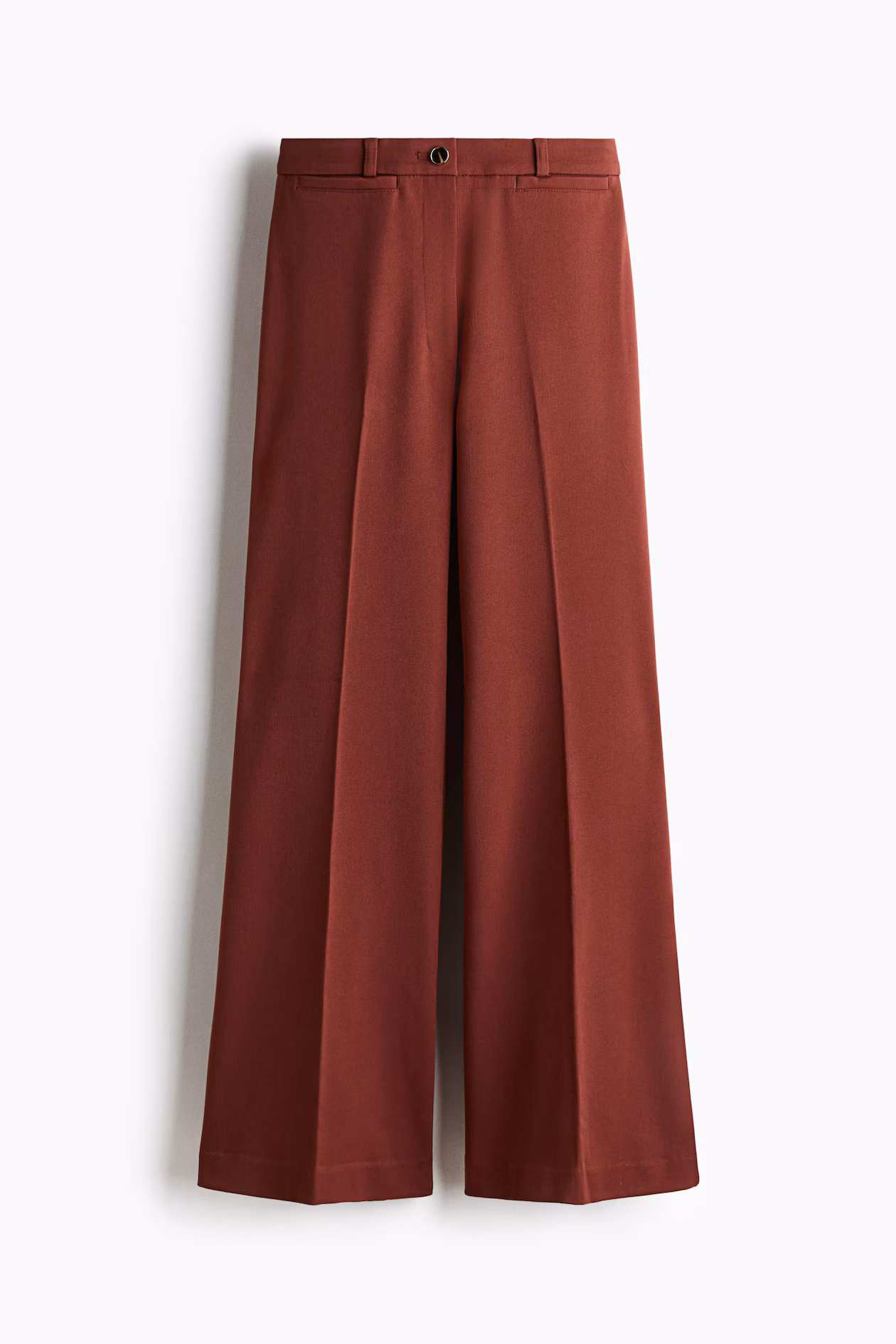 Fitted dress pants in woven fabric. High waist, zip fly with button, mock welt front pockets, and mock welt back pockets. Flared legs with creases at front and back.