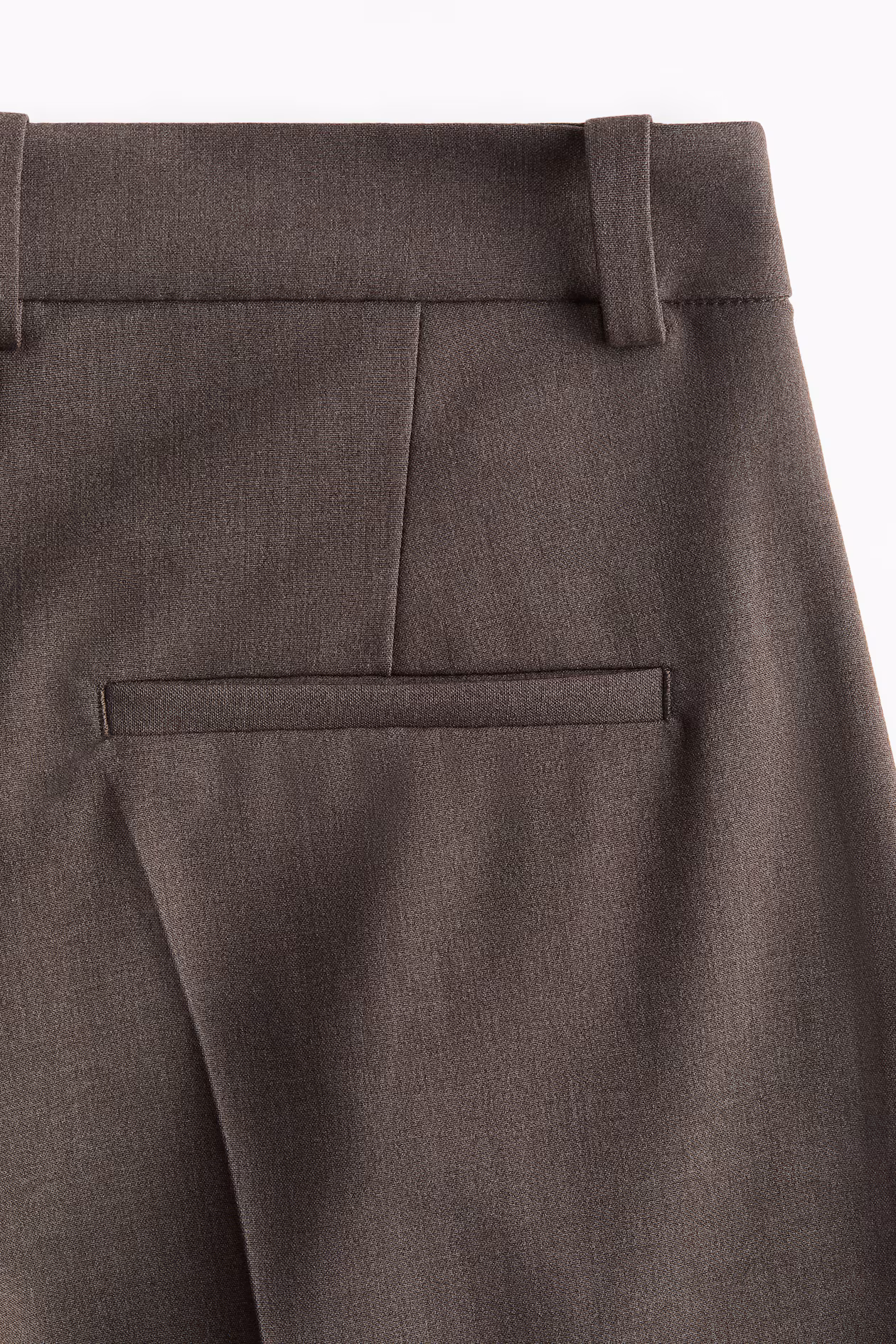 Loose-fit dress pants in woven fabric with pleats at front. High waist and zip fly with concealed button and hook-and-bar fastening. Diagonal side pockets, mock welt back pockets, and wide legs with creases at front and back.