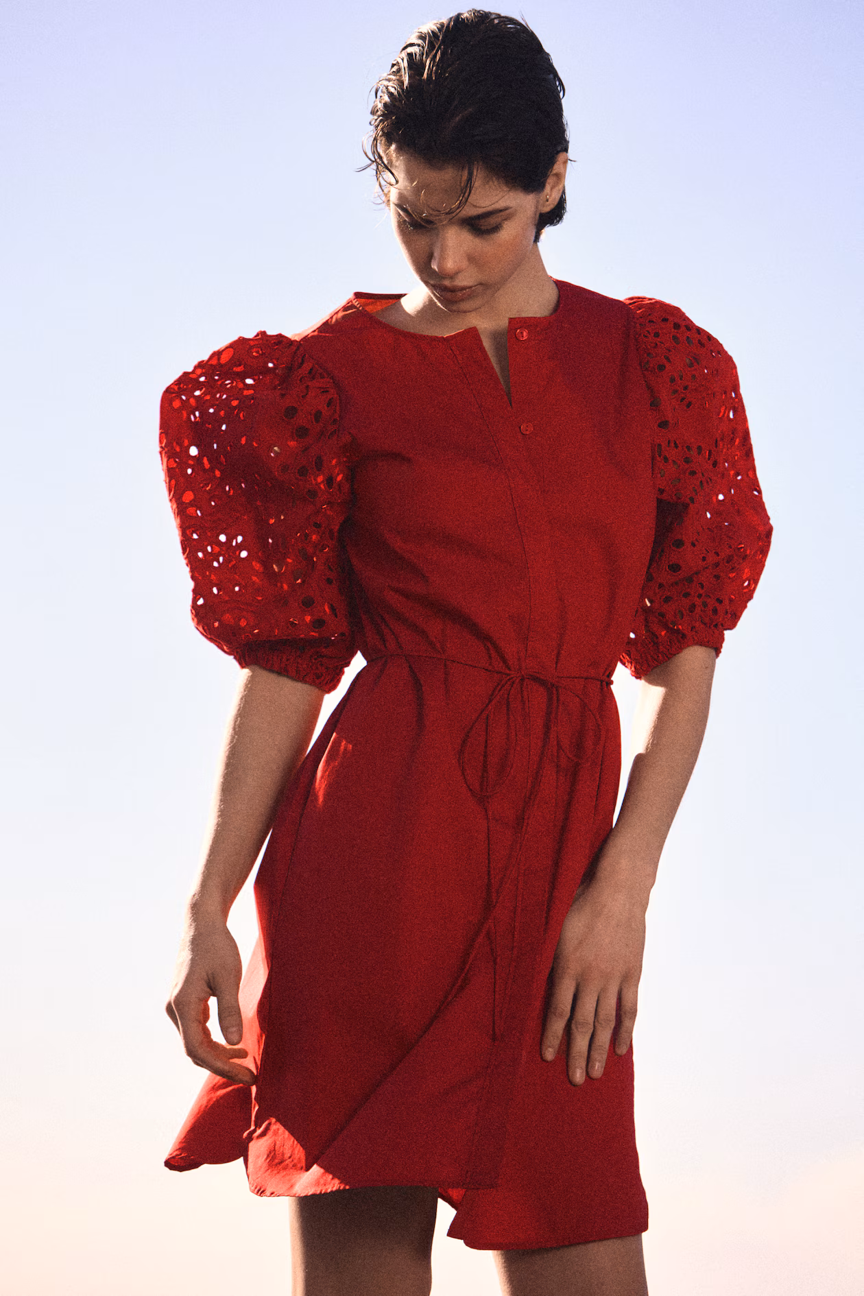 Knee-length dress in airy, woven cotton. Round neckline, concealed buttons at front, and an extra-narrow, removable tie belt at waist. Elbow-length, eyelet-embroidered puff sleeves with elasticized cuffs. Unlined.