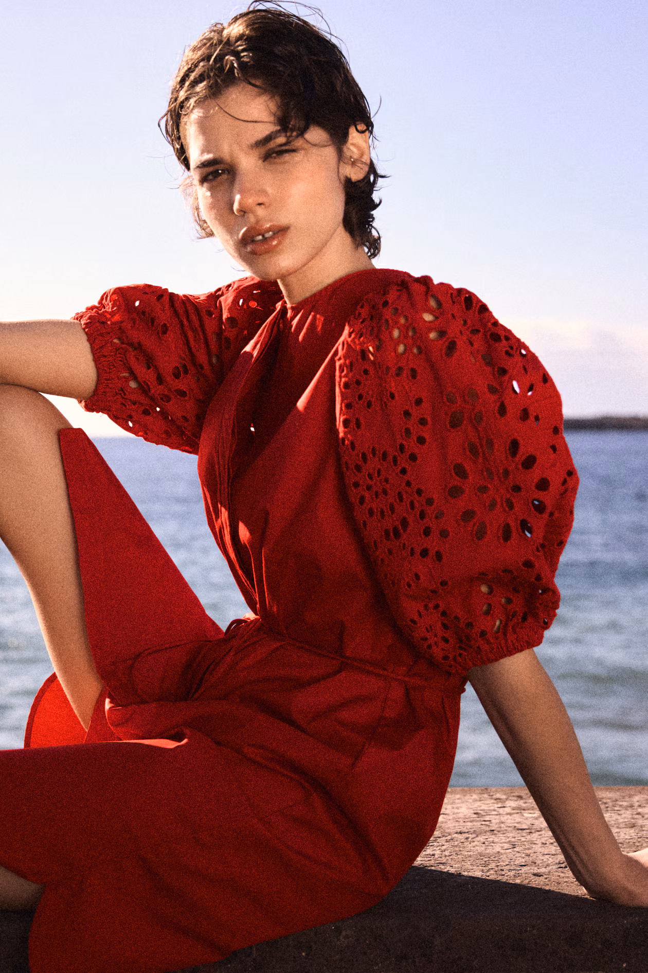 Dress with Eyelet-Embroidered Sleeves