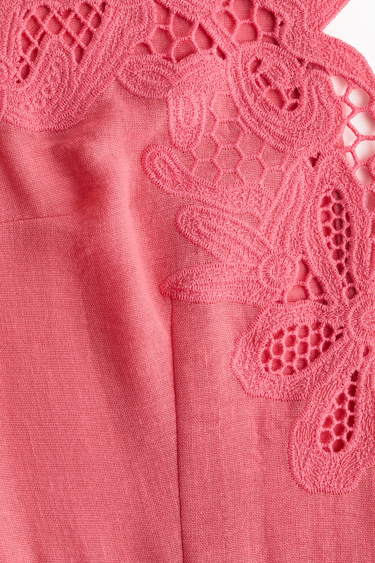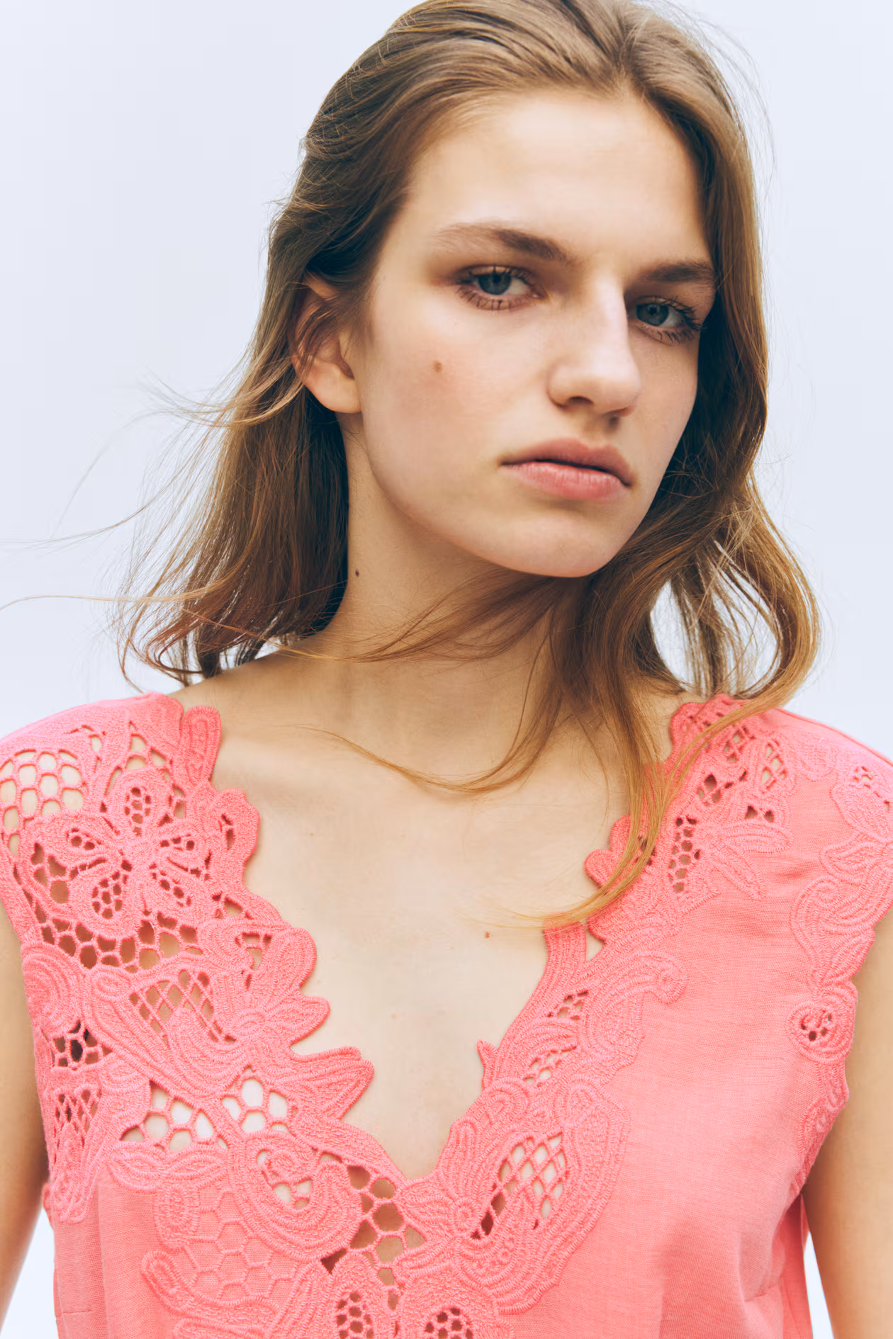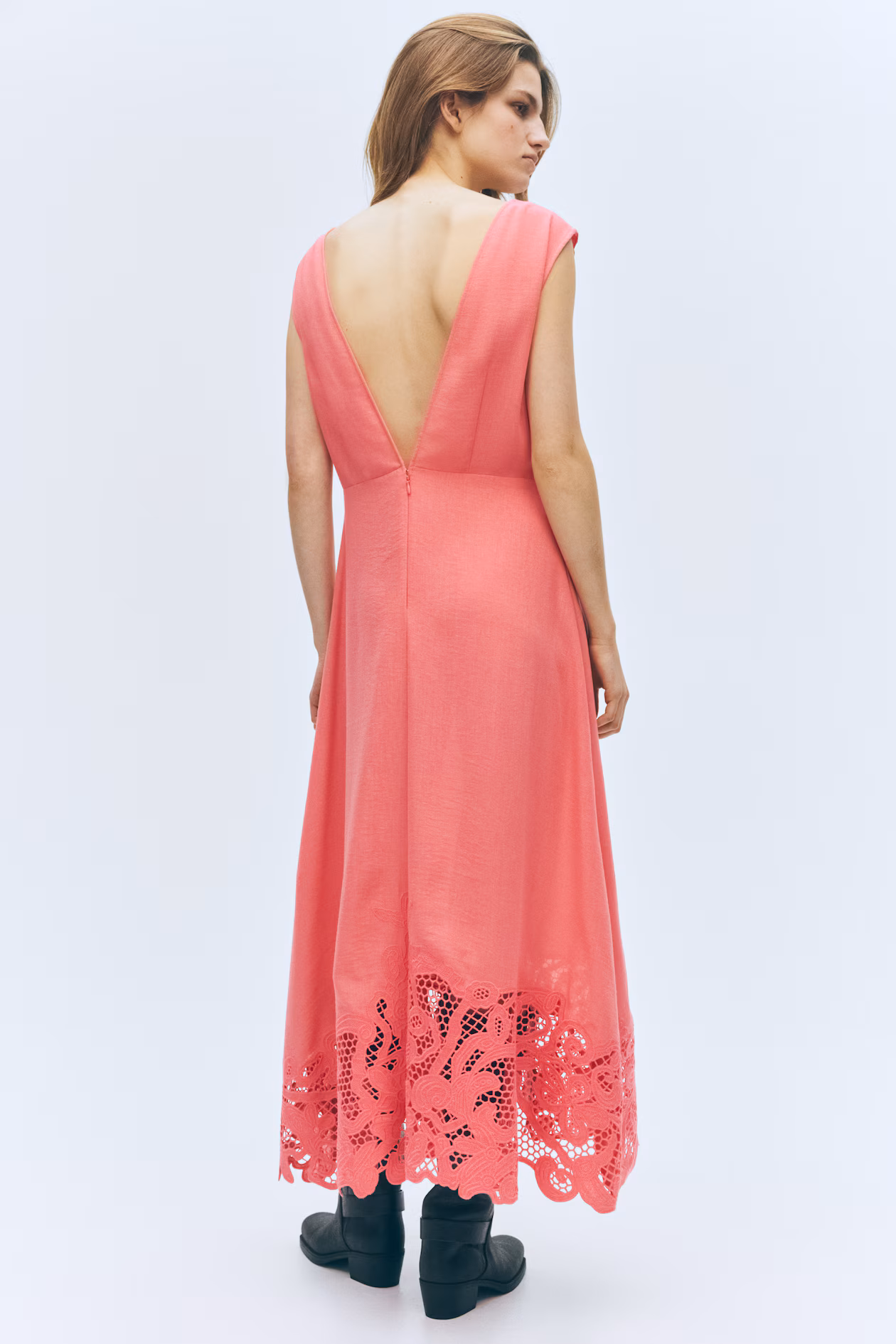 Long, sleeveless, slim-fit dress in woven fabric with asymmetric, eyelet-embroidered details at top and hem. Low-cut V-neck at front and back, concealed zipper at back, and a gently flared skirt. Unlined.