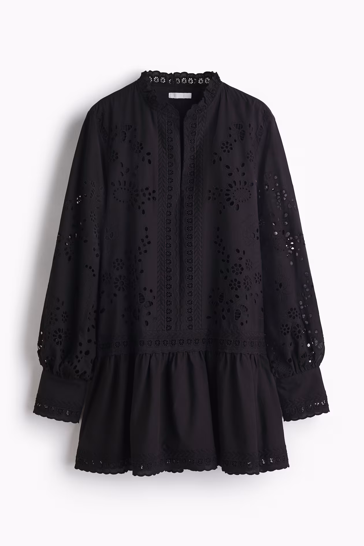 Short dress in eyelet-embroidered woven cotton. Ruffle collar with scalloped edge, slit at front, and gathered seam at hip. Long balloon sleeves, cuffs with slit and button, and a gently flared hem. Partly lined.