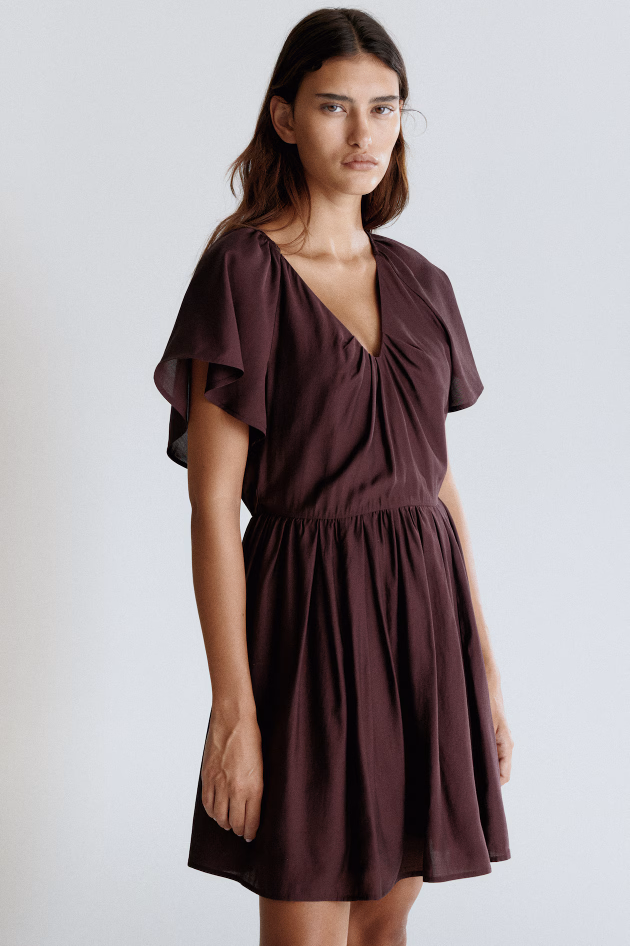 Short dress in a woven viscose blend. V-neck with pleats at front. Concealed zipper at one side, raglan butterfly sleeves, and gathers at waist for added volume. Flared, lined skirt.
