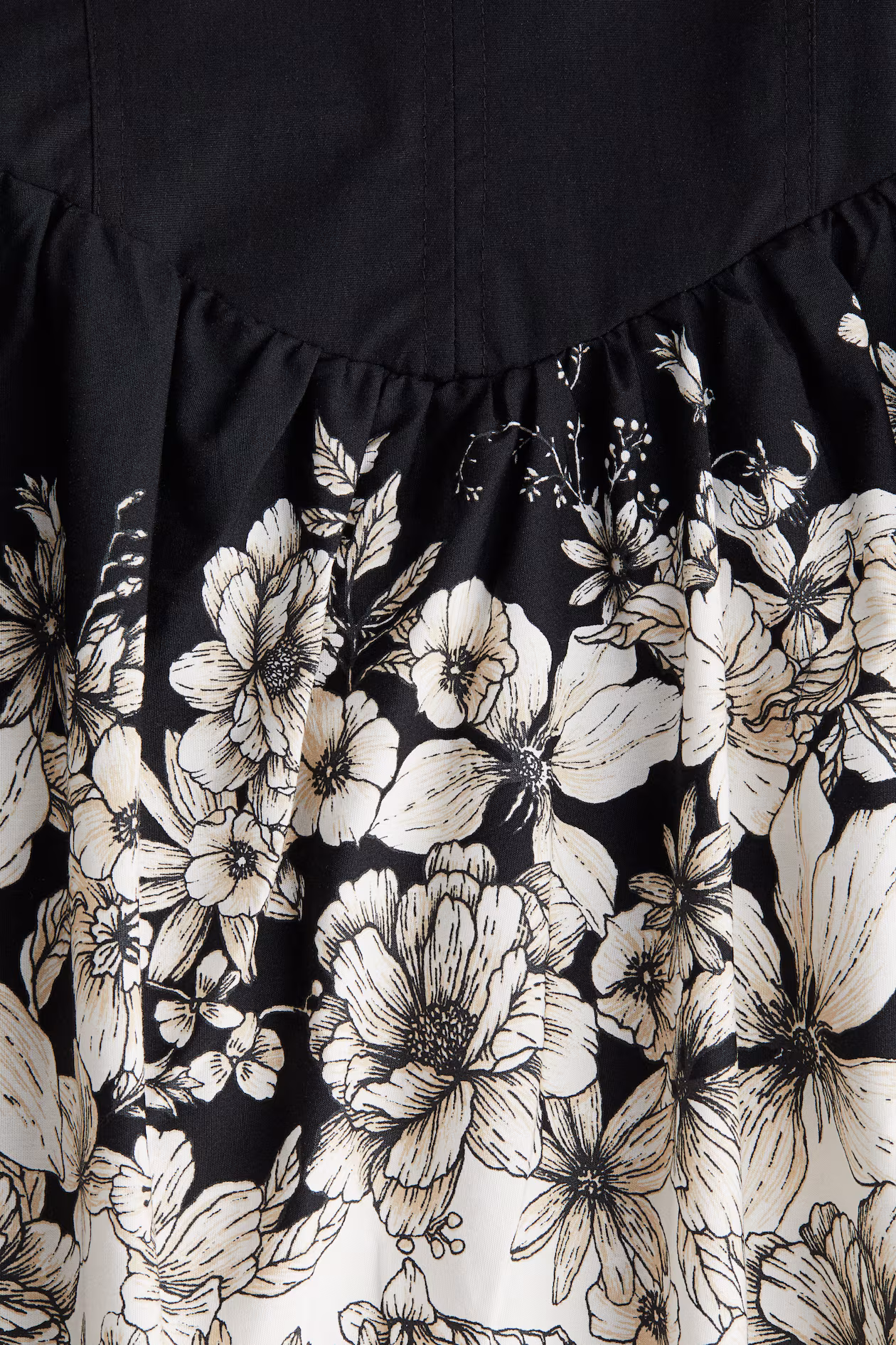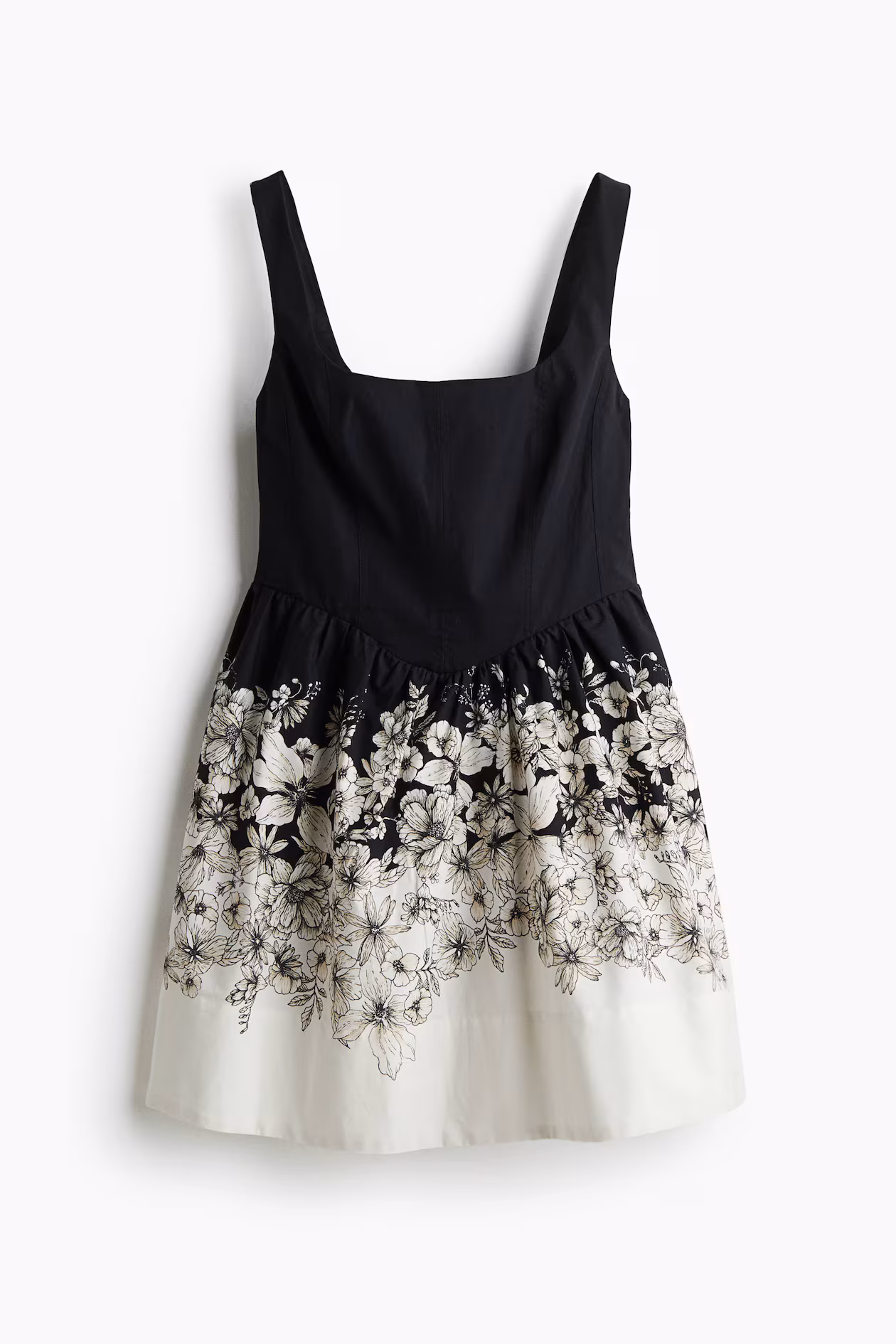 Short dress in woven cotton with a lined, fitted bodice and flared skirt. Wide shoulder straps, square neckline, and corset-like seams at front and back. Concealed zipper at back with hook-and-eye fastener and a gathered seam at waist.