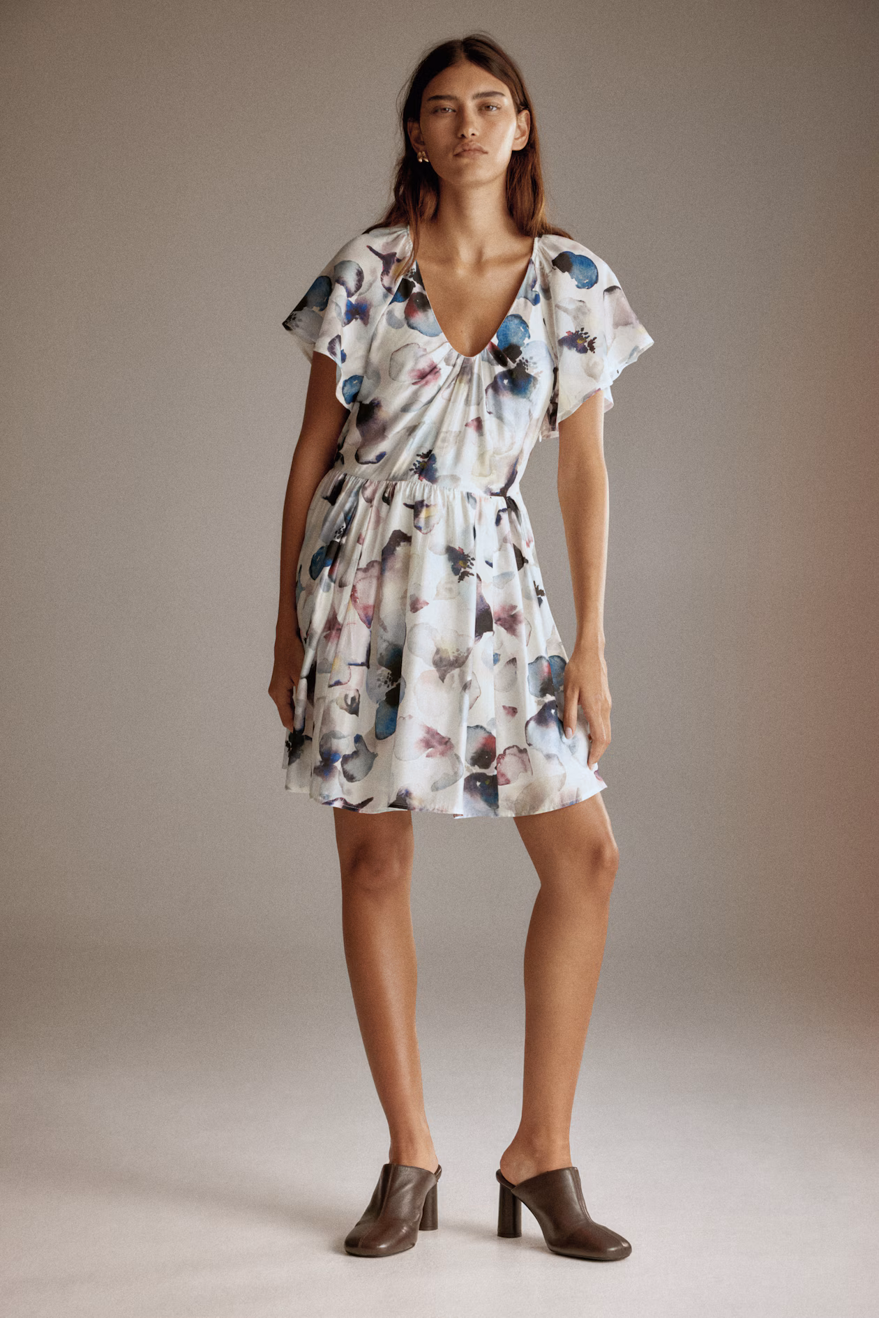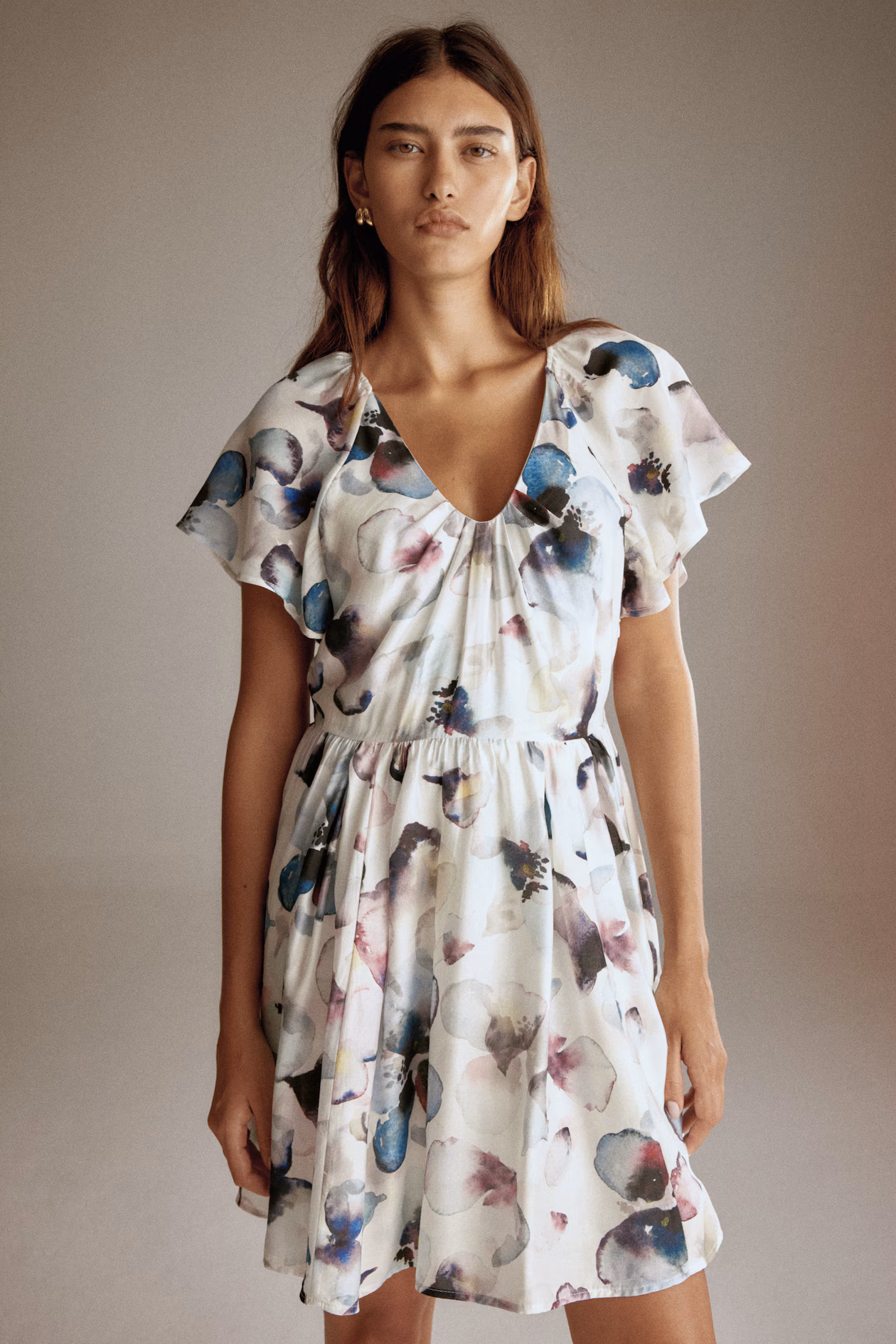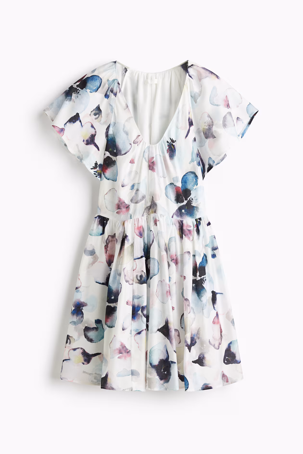 Short dress in a woven viscose blend. V-neck with pleats at front. Concealed zipper at one side, raglan butterfly sleeves, and gathers at waist for added volume. Flared, lined skirt.