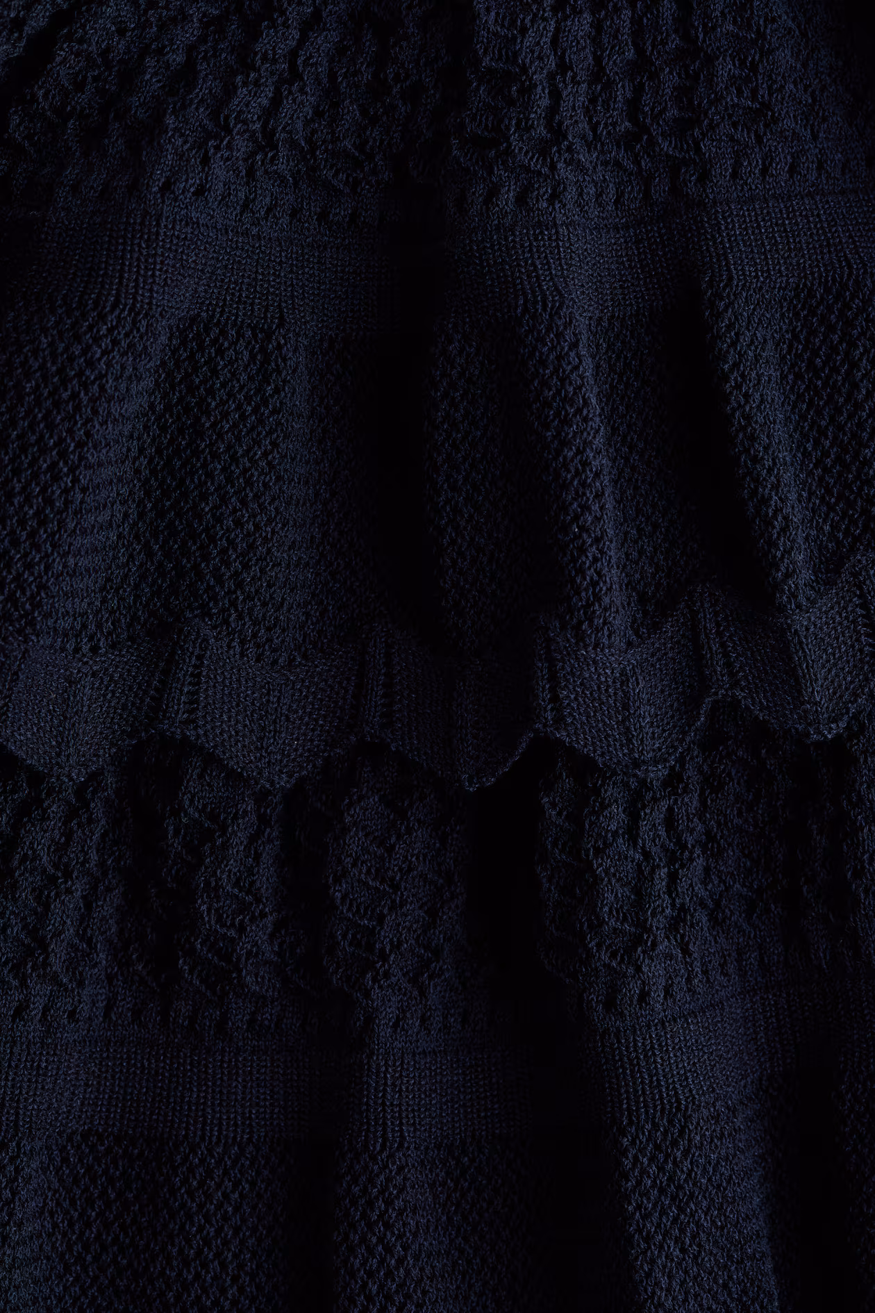 Short, fitted dress in a fine rib knit. Round neckline, long sleeves, and a crochet-look skirt with flounced tiers with scalloped edges.