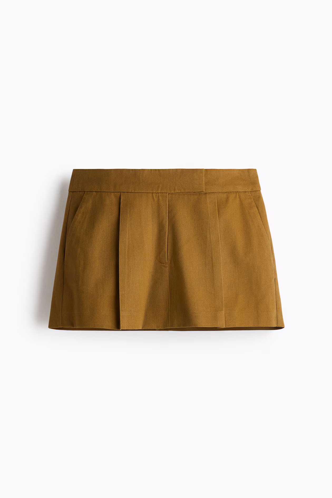 Mini skort in woven fabric with flattering pleats at front. Extended waistband tab with hook-and-bar fasteners, zip fly, diagonal side pockets, and a mock welt back pocket.