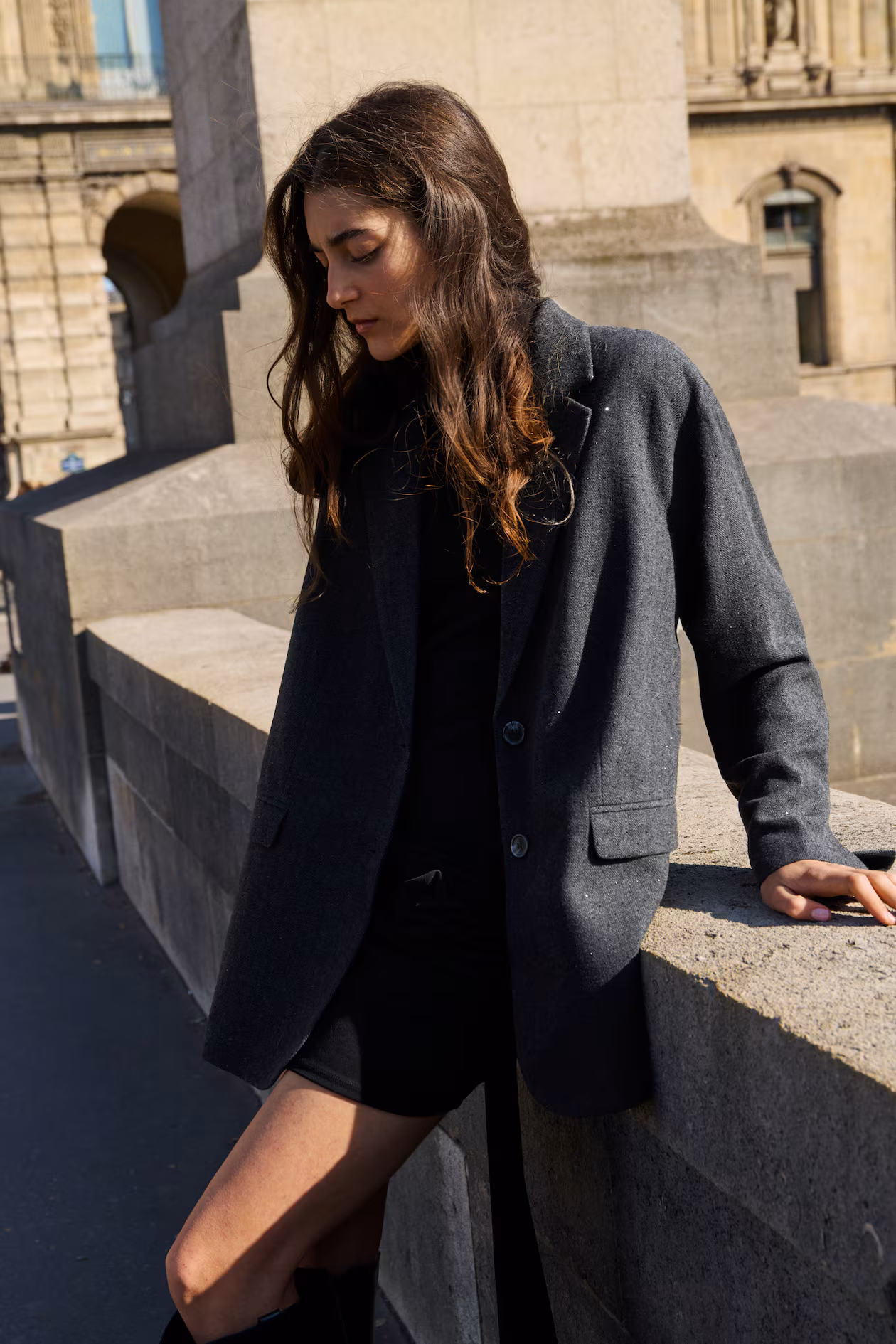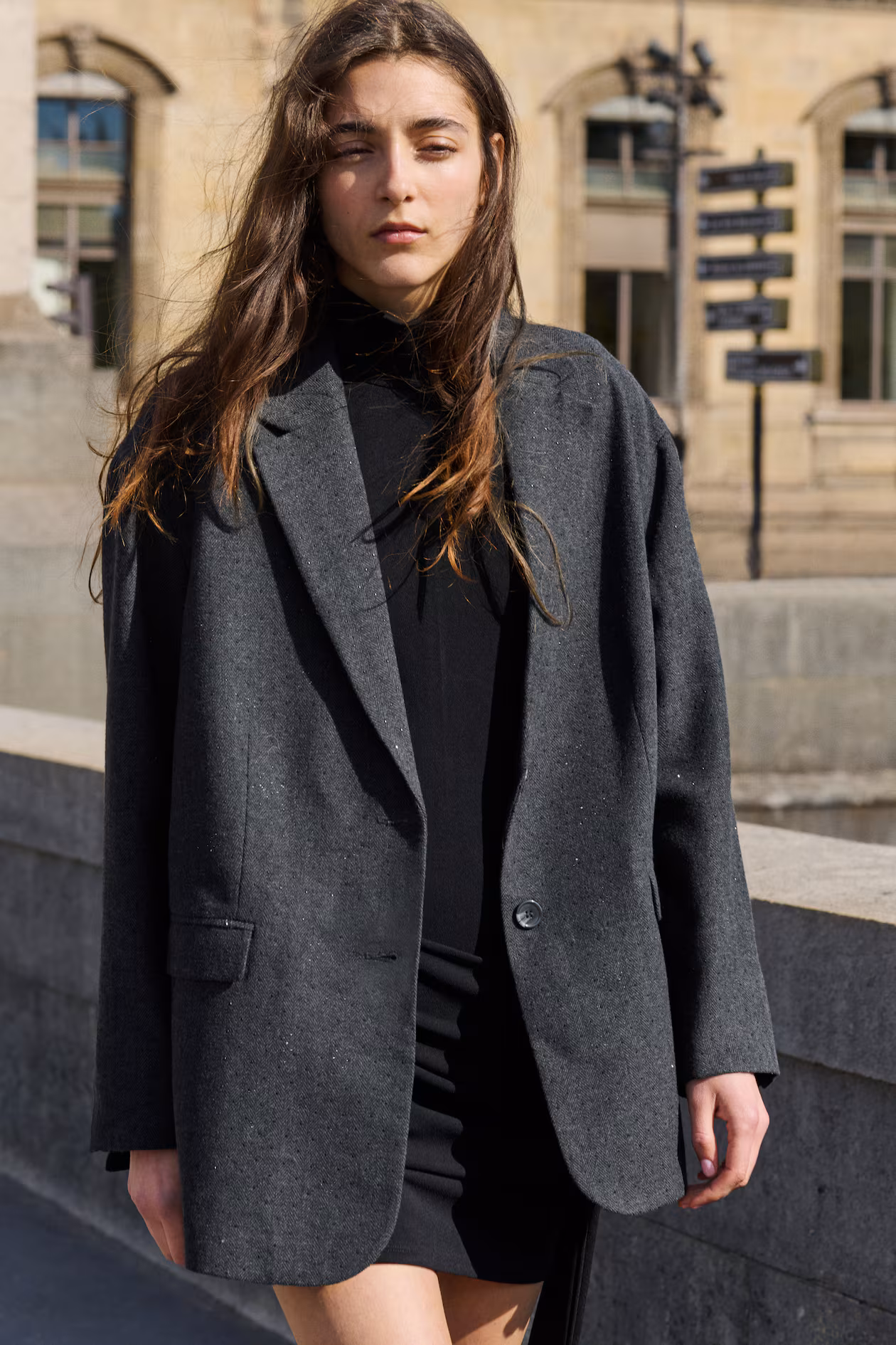 Oversized, herringbone-weave blazer embellished with tone-on-tone rhinestones. Notched lapels, single-breasted front, and welt front pockets with a flap. Long sleeves with a slit at cuffs. Lined.