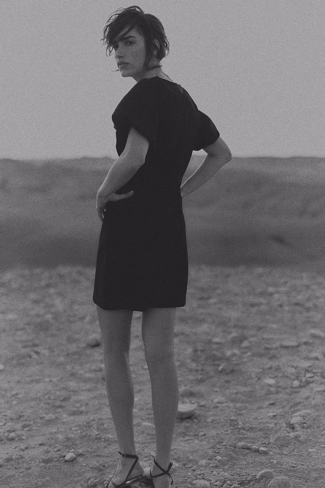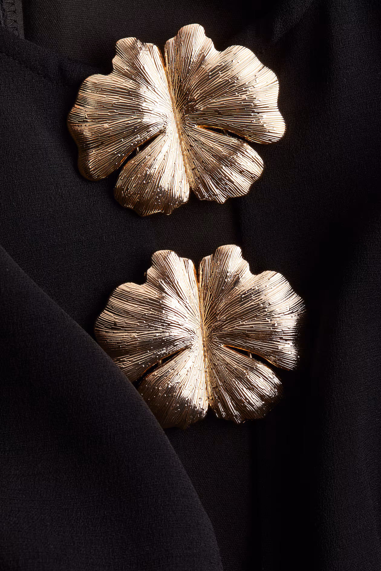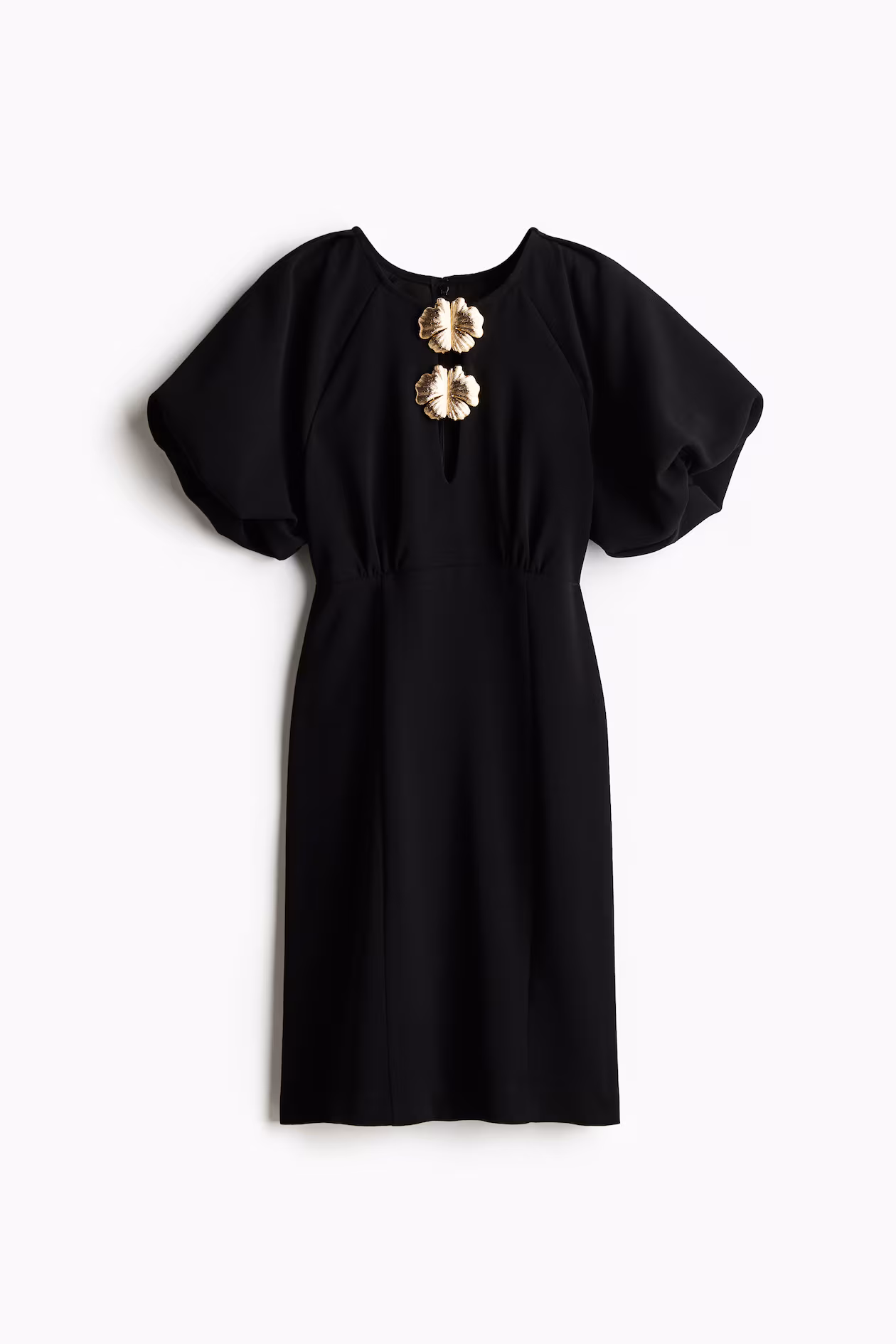 Short, fitted dress in woven fabric with vertical shaping seams at front and back for a flattering silhouette. Round neckline, slit opening at front with two flower-shaped metal details, and a concealed zipper at back with hook-and-eye fastener. Gathered seam below bust. Inverted box pleats on shoulders, short raglan balloon sleeves, and concealed elastic at the cuffs. Partly lined.