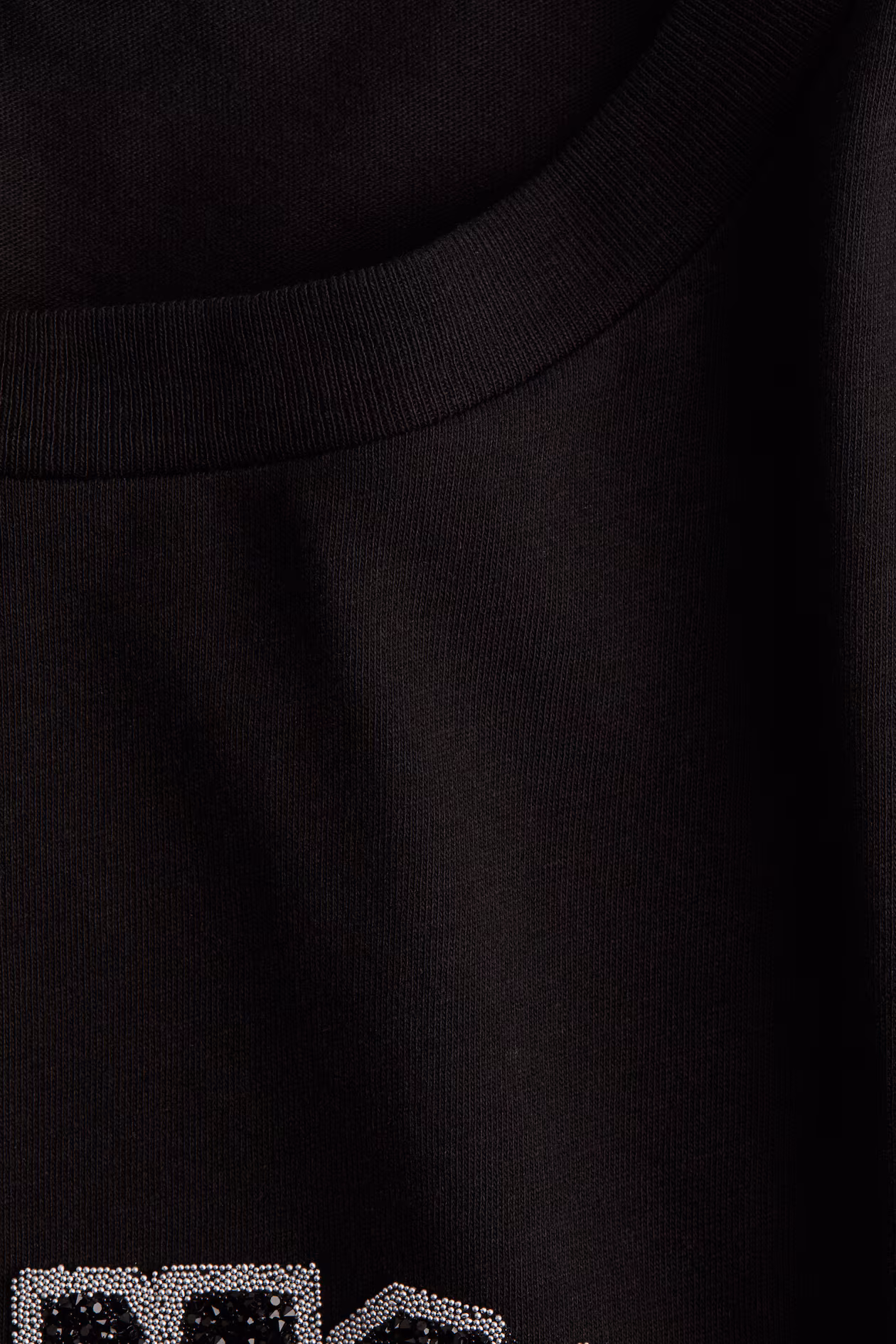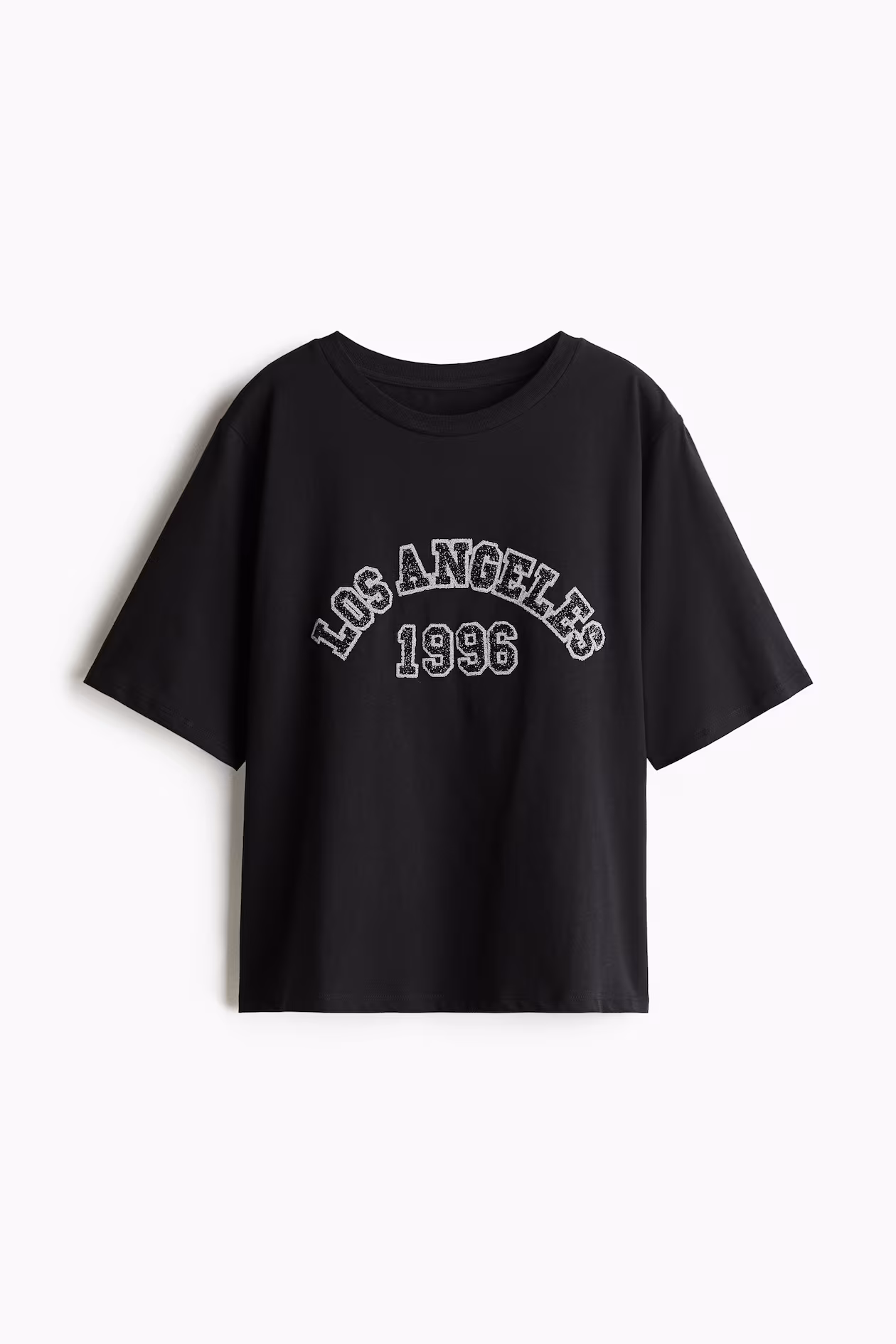 Loose-fit T-shirt in soft cotton jersey with an embellished text motif at front. Round neckline, dropped shoulders, and sleeves finishing just above elbow.