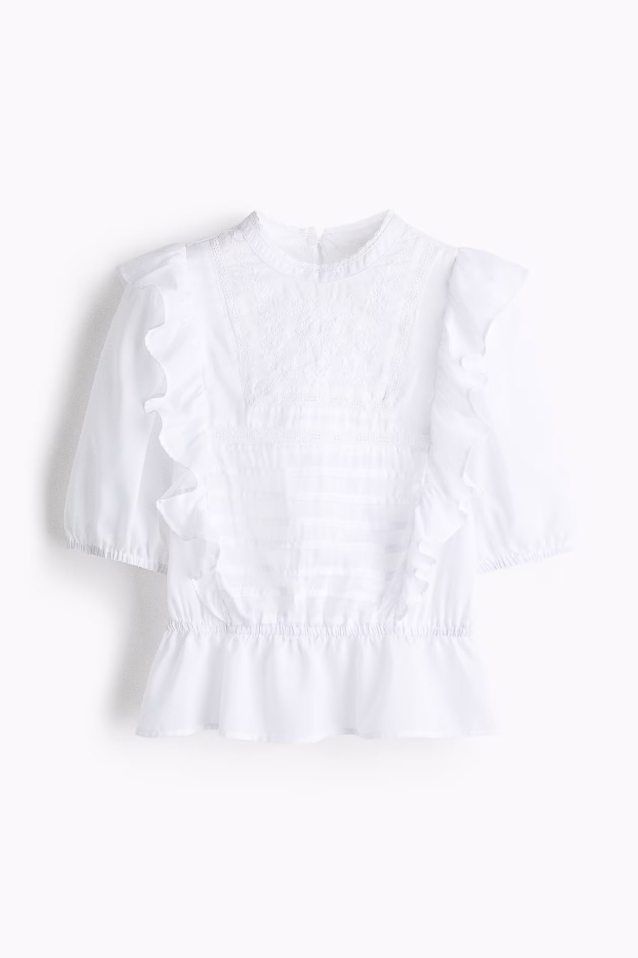 Short blouse in woven fabric with embroidery, lace insets, and pleats at front. Round, lace-trimmed neckline, keyhole opening at back with a button, and flounces at front extending over shoulders to back. Short puff sleeves with narrow elastic at cuffs. Elasticized seam at waist for a flared peplum.
