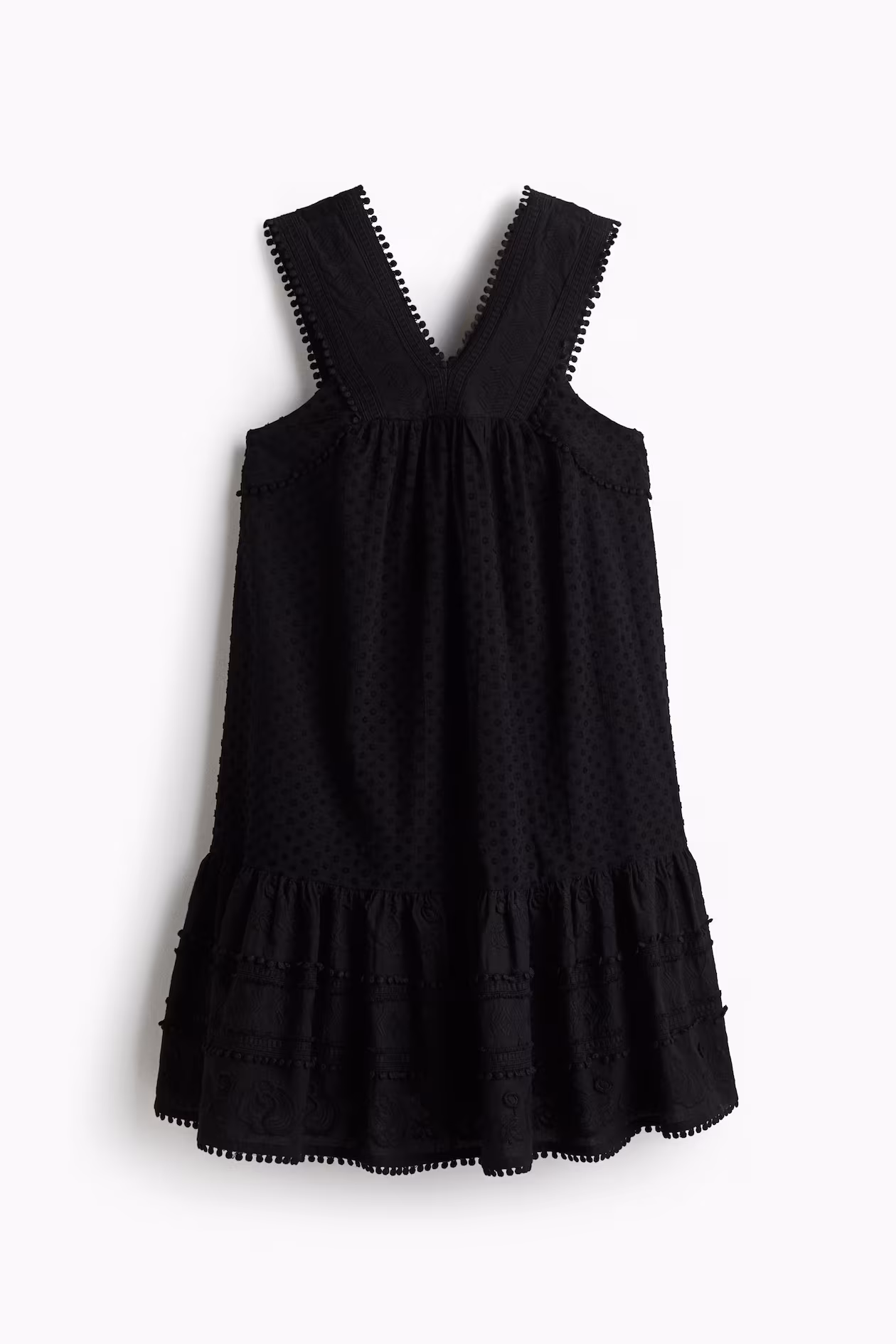 Short, loose-fit dress in woven cotton with tonal embroidery and decorative pompom trim. Wide shoulder straps joined at front, keyhole opening at back with concealed buttons, and gathers at top. Gathered seam above hem for added volume. Lining in cotton voile.