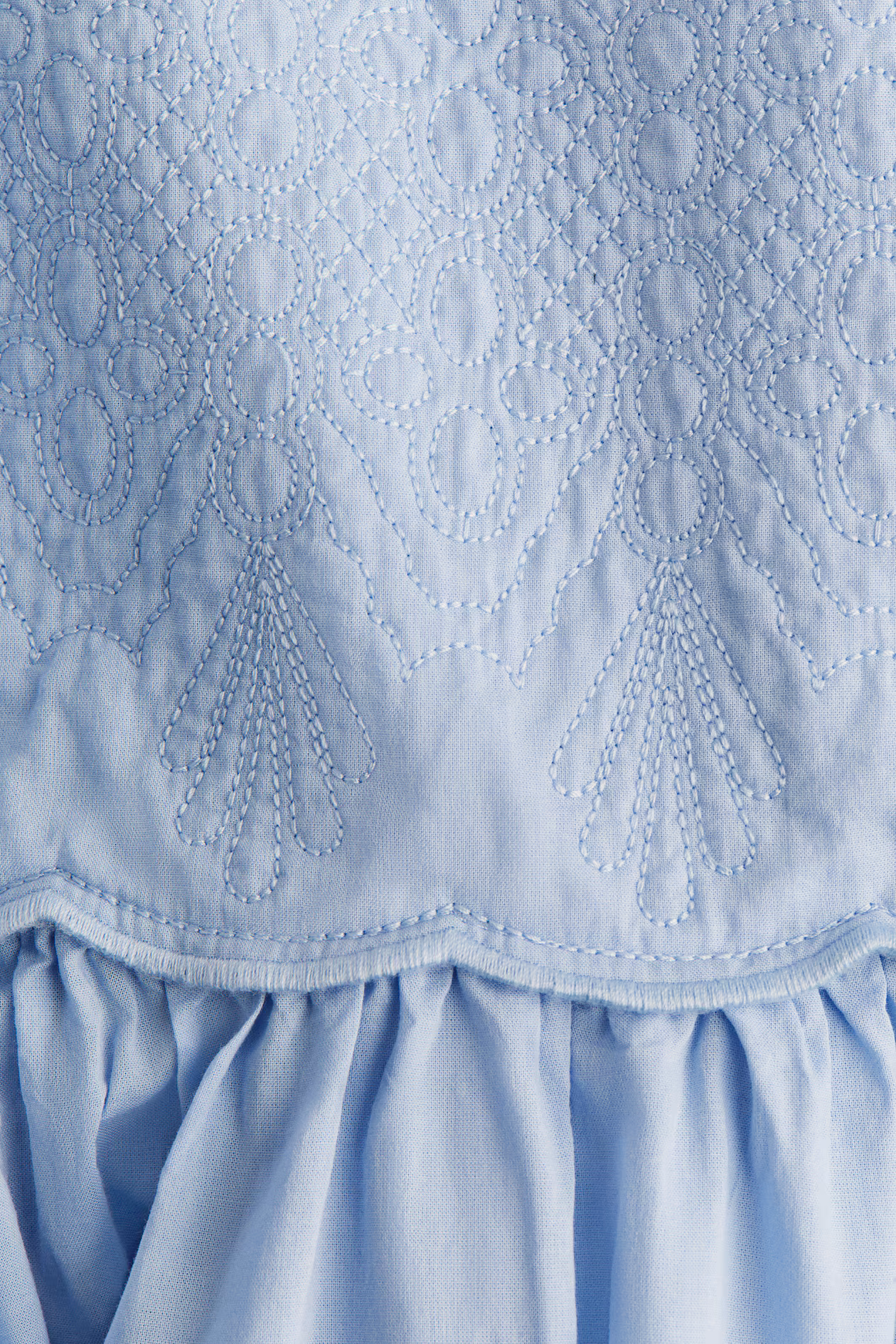 Short dress in woven cotton with a fitted, lightly padded bodice with an embroidered pattern and scalloped edges. Adjustable, extra-narrow shoulder straps, concealed zipper at back, and gathered seam at waist. Flared skirt. Cotton lining.