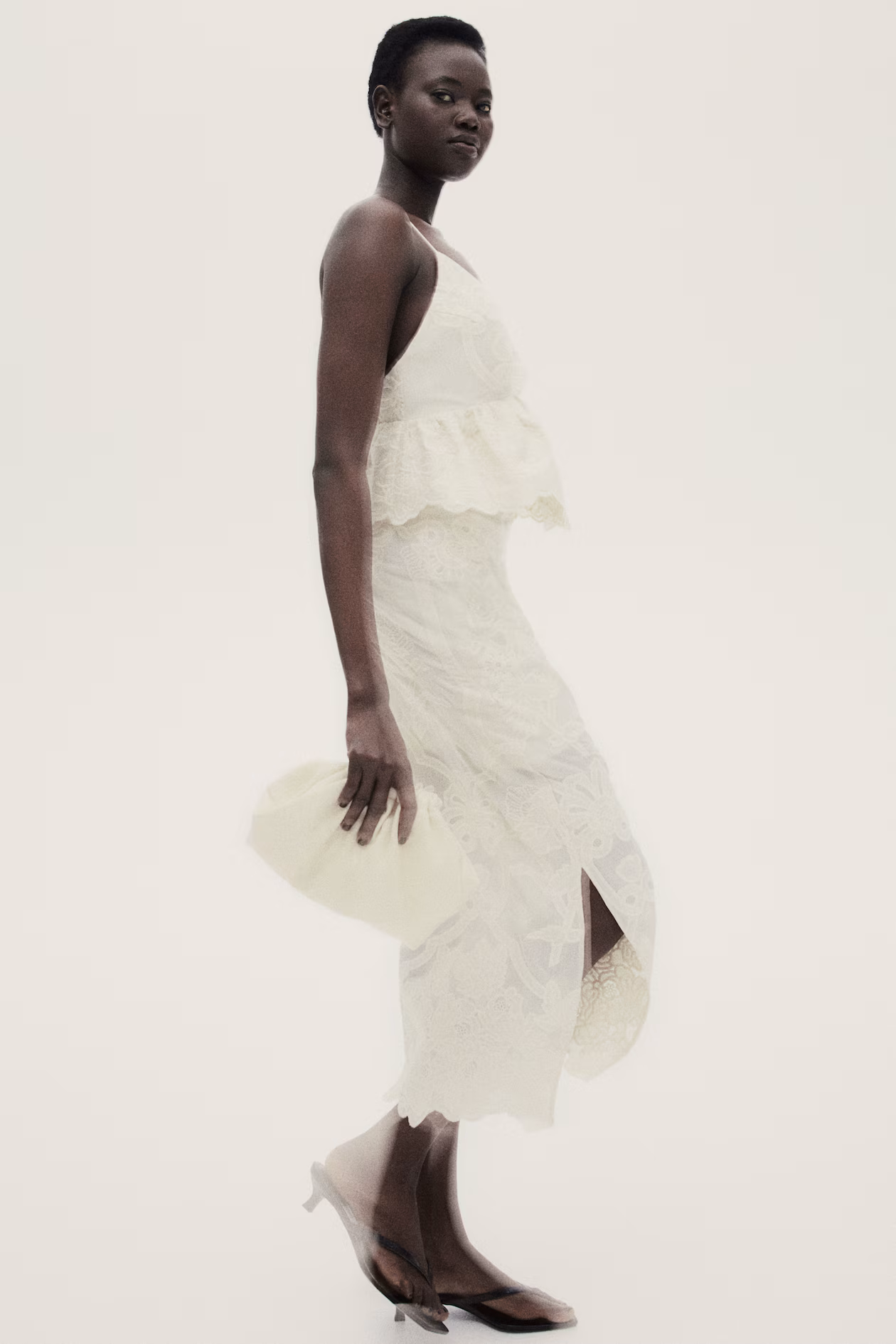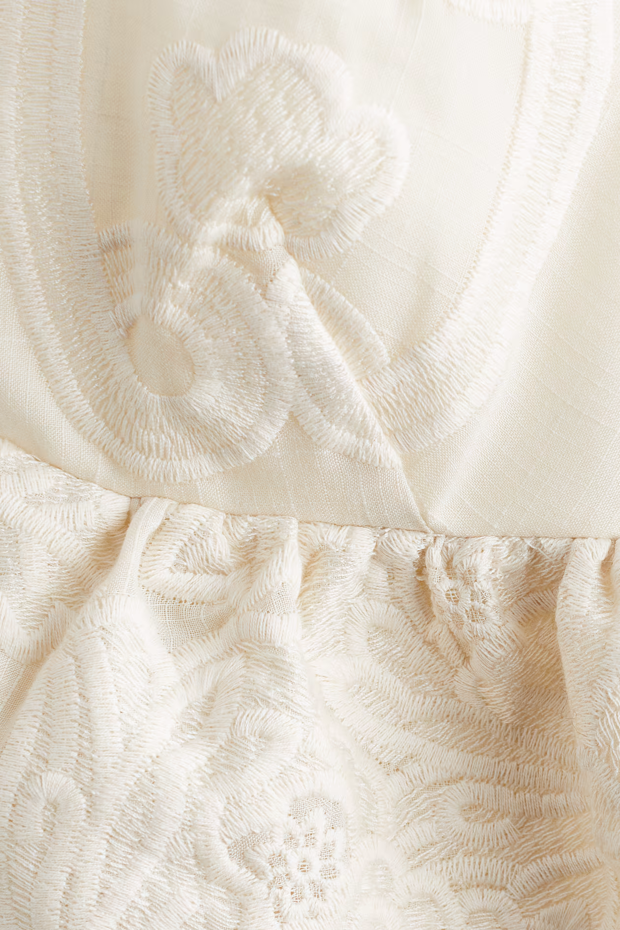 Short top in woven fabric with embroidery. Extra-narrow shoulder straps crossed at back. Low-cut V-neck at front, open back, and a concealed zipper at one side. Gathered seam below bust with a scalloped-edge peplum. Lining in cotton voile.