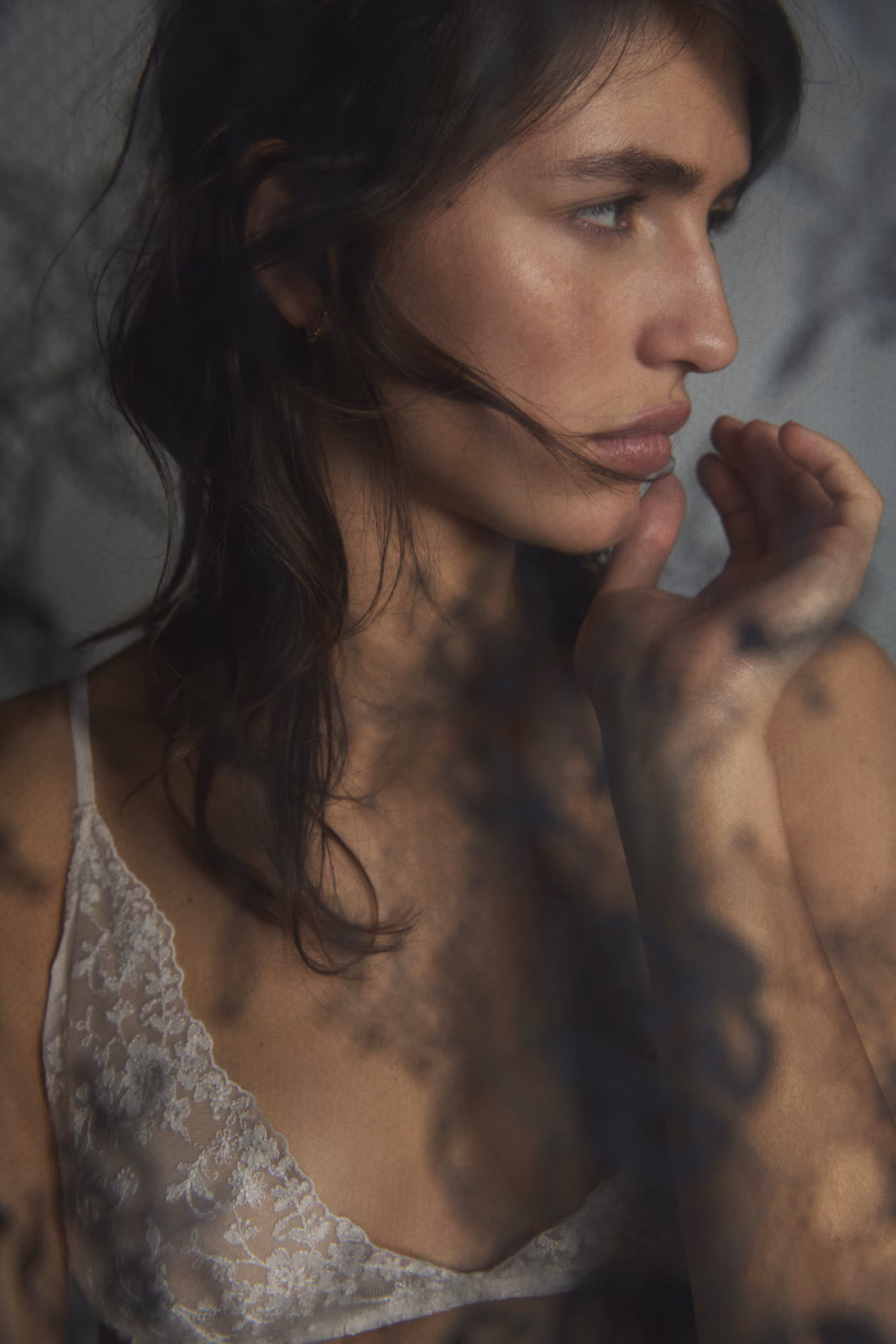 Soft-cup bra in embroidered mesh. Adjustable shoulder straps, unlined cups for natural shape and light support, and hook-and-eye fastening at back.
