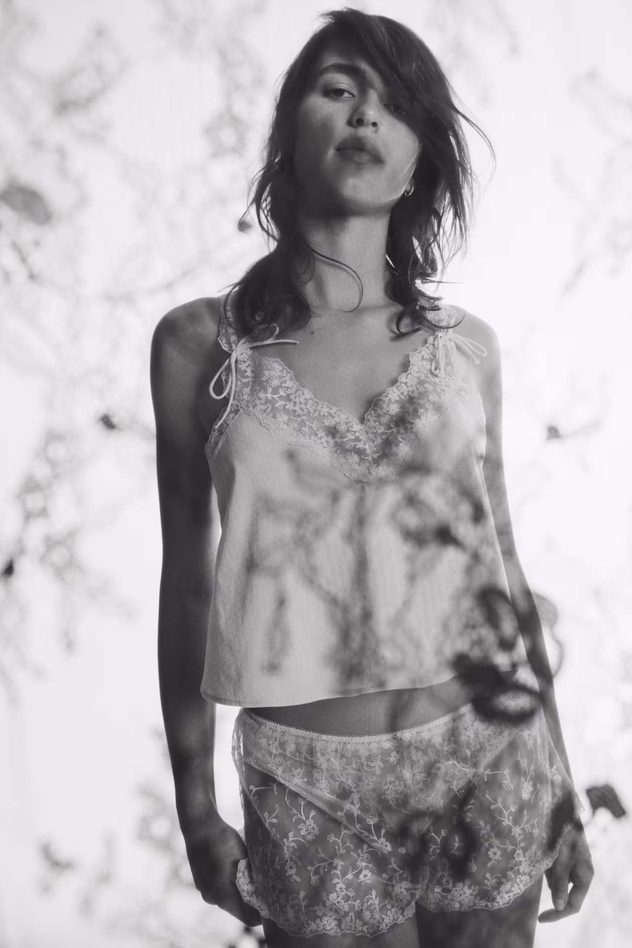 Short top in woven crêpe fabric. Wide shoulder straps in embroidered mesh, crossed at back, with satin ties at front. Low-cut V-neck with trim in embroidered mesh. Straight-cut hem with a small slit at sides.