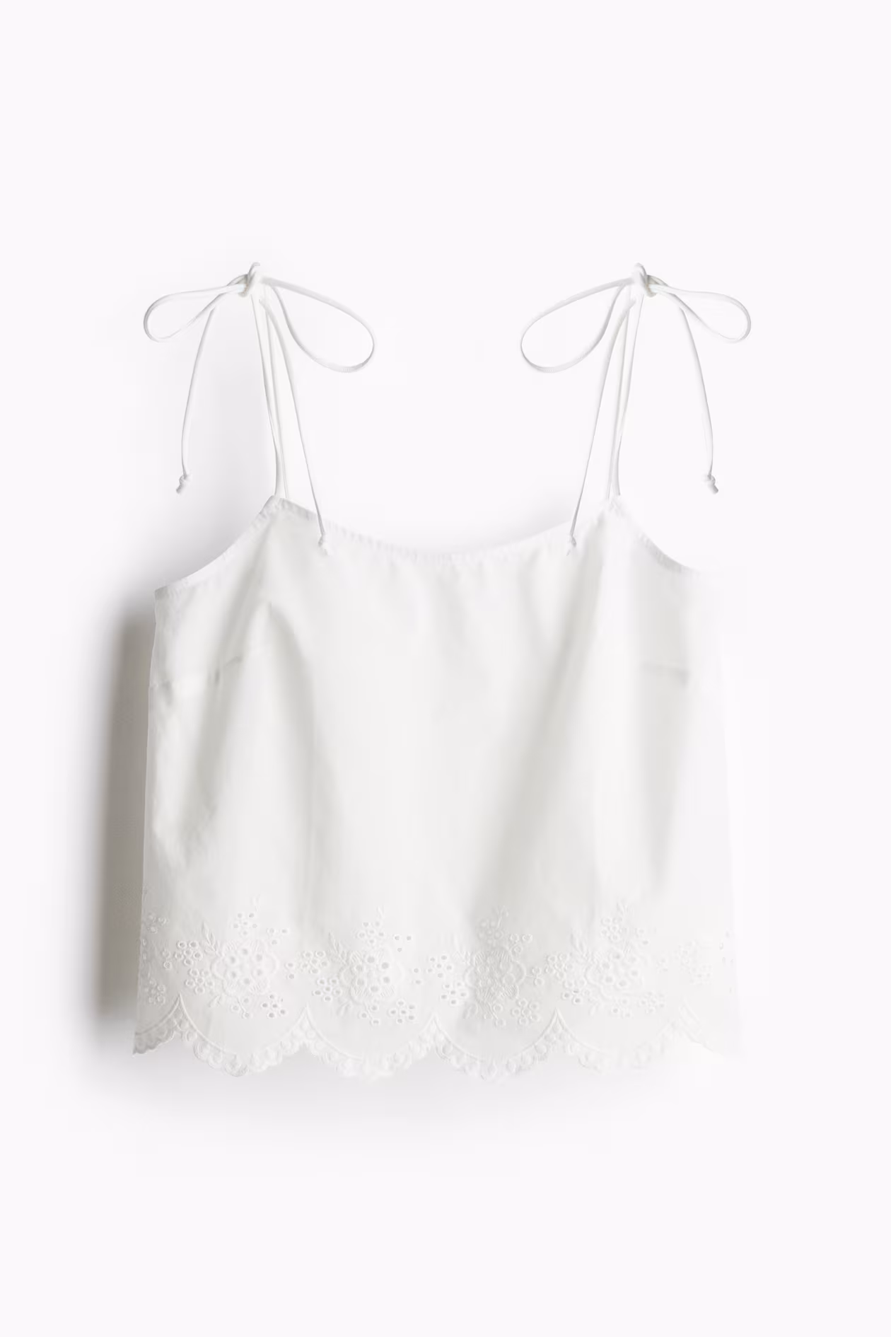Top in a soft woven cotton. Narrow tie-top shoulder straps and a scalloped-edge hem.