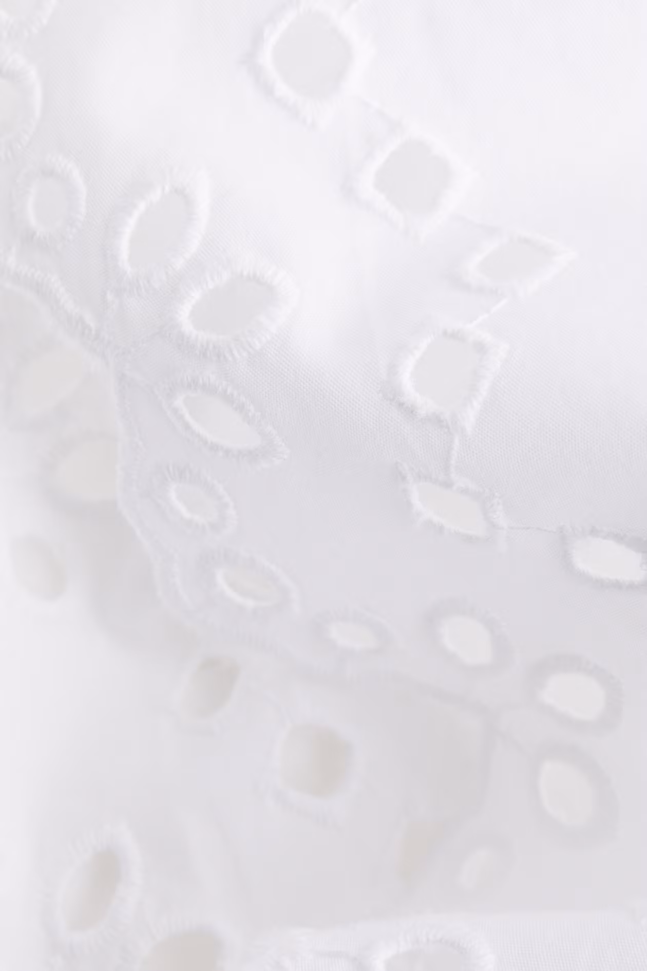 Blouse in woven cotton. Band collar, V-shaped opening at front, and short puff sleeves with eyelet embroidery and scalloped-edge cuffs.