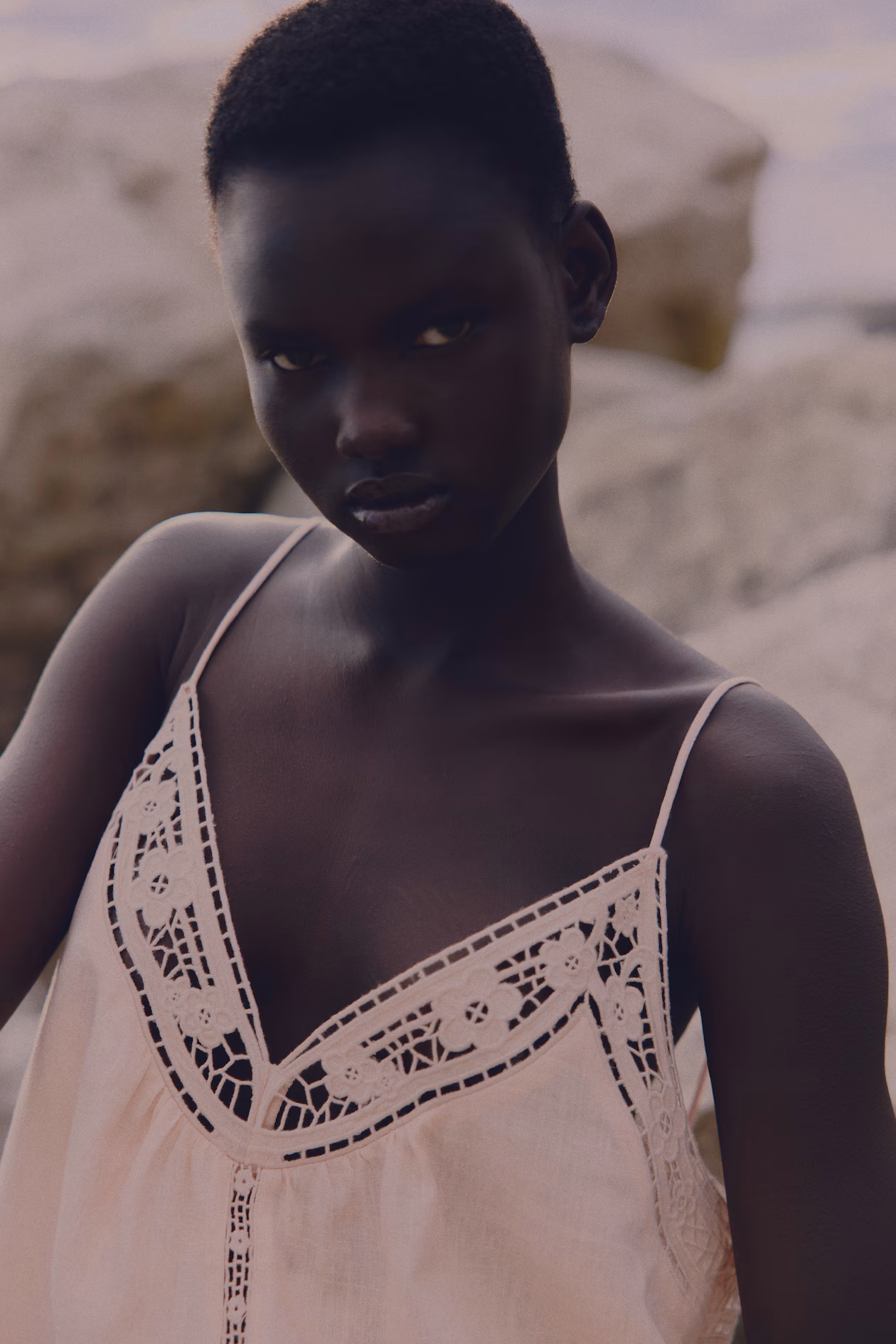 Calf-length, A-line dress in an airy, woven linen and viscose blend. Extra-narrow, tie-top shoulder straps, V-neck at front, and eyelet-embroidered section around upper edge. Gathers at front and back, and a narrow, vertical lace inset at front. Unlined.