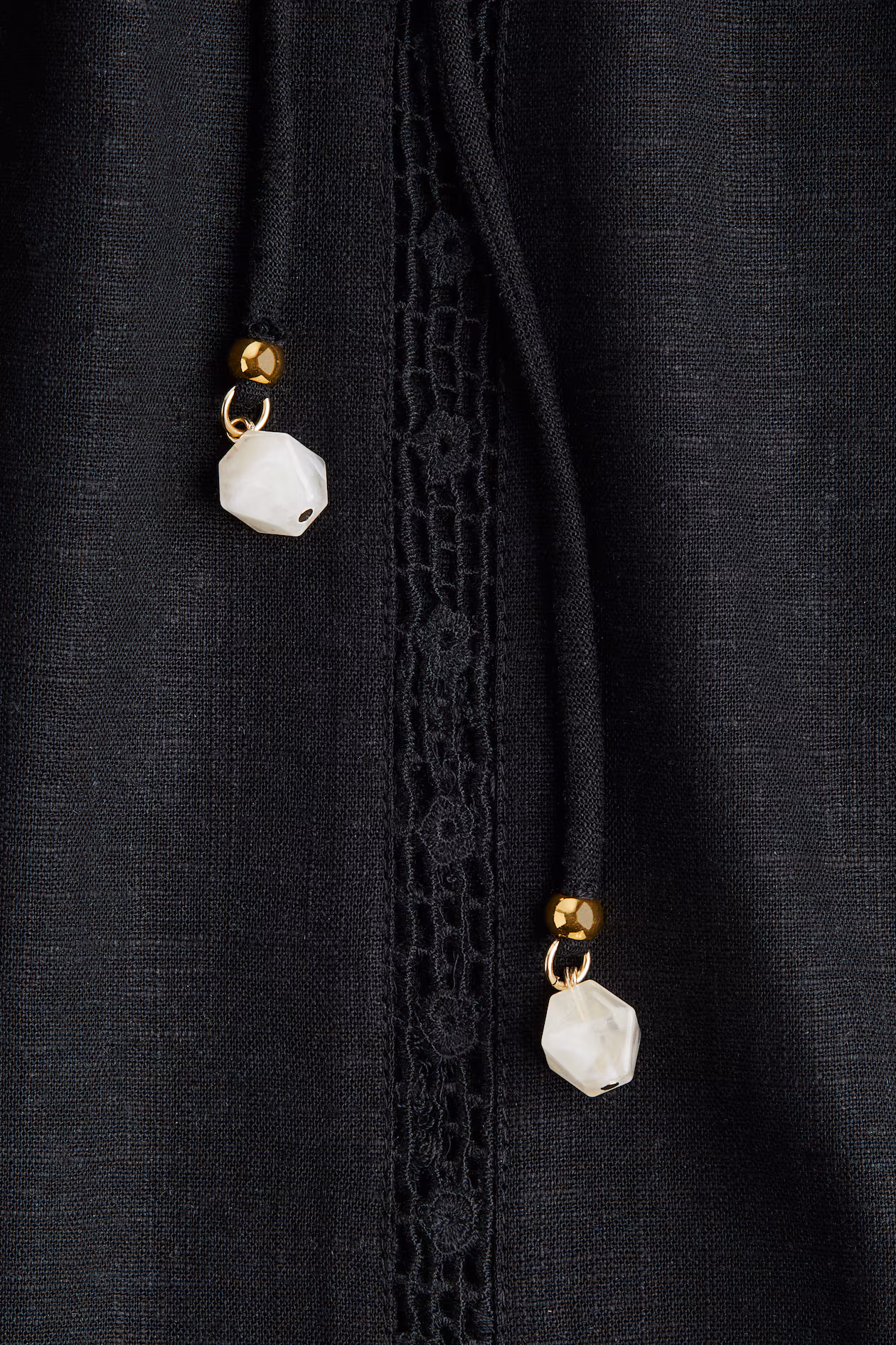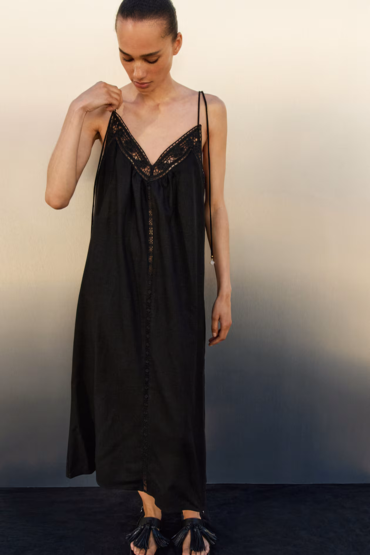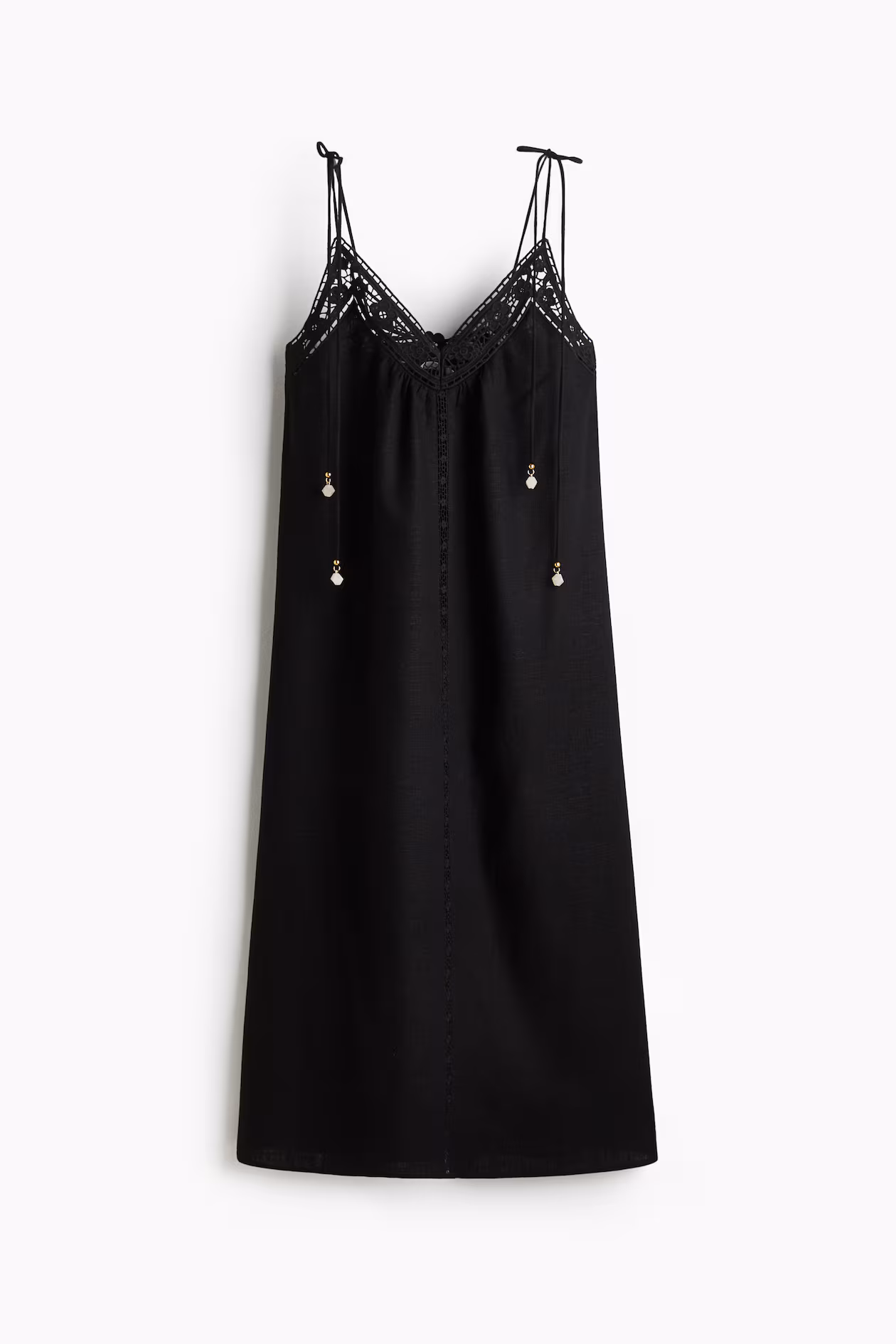 Calf-length, A-line dress in an airy, woven linen and viscose blend. Extra-narrow, tie-top shoulder straps, V-neck at front, and eyelet-embroidered section around upper edge. Gathers at front and back, and a narrow, vertical lace inset at front. Unlined.